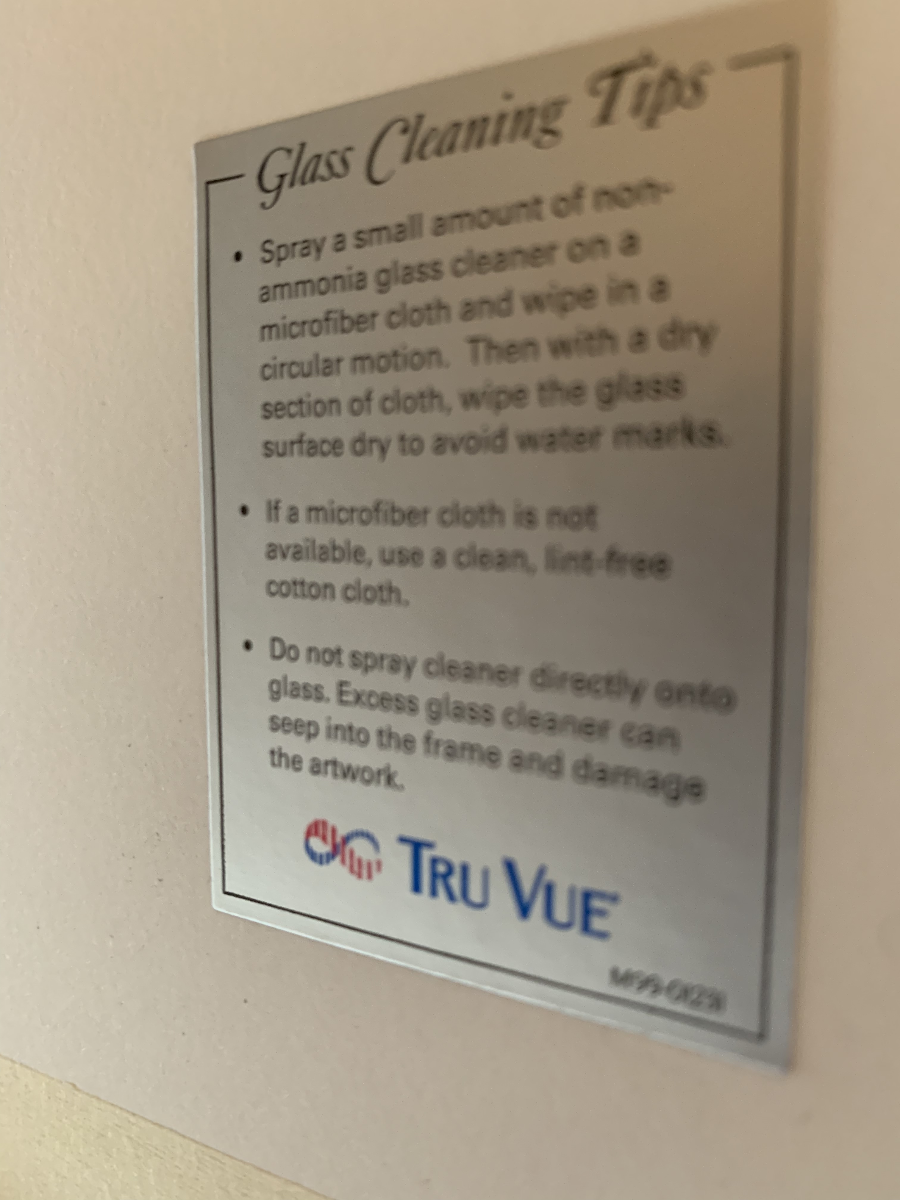 Fikk innrammet endel verk med UV70/AR glass. Det er klistret Tru Vue bak, men ingen detaljer om glasset.