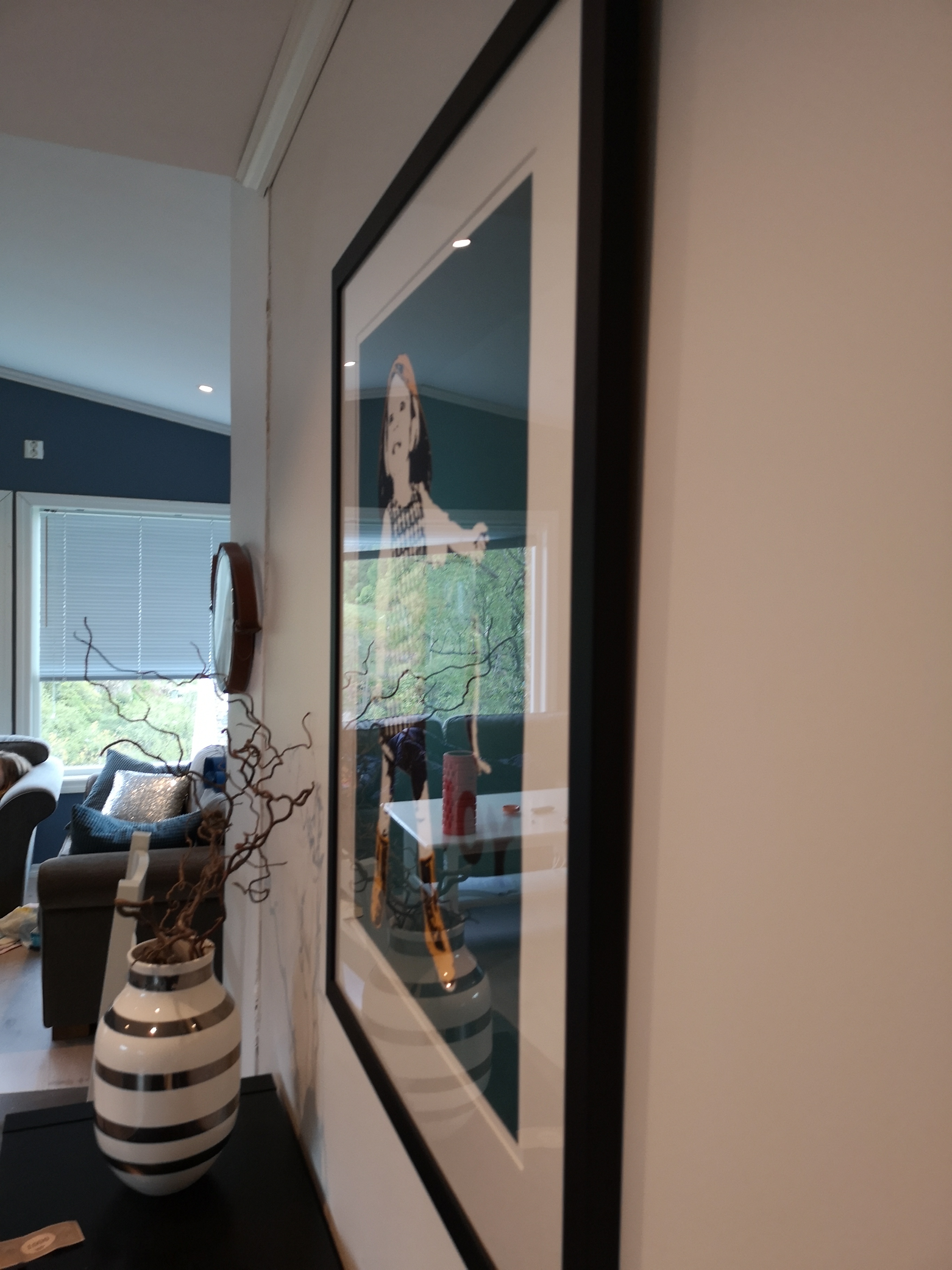 Dette har også artglass, uv 70. Ser veldig stor forskjell når du står rett foran og ser rett på bildet. Kontra andre bilder jeg har med floatglass.