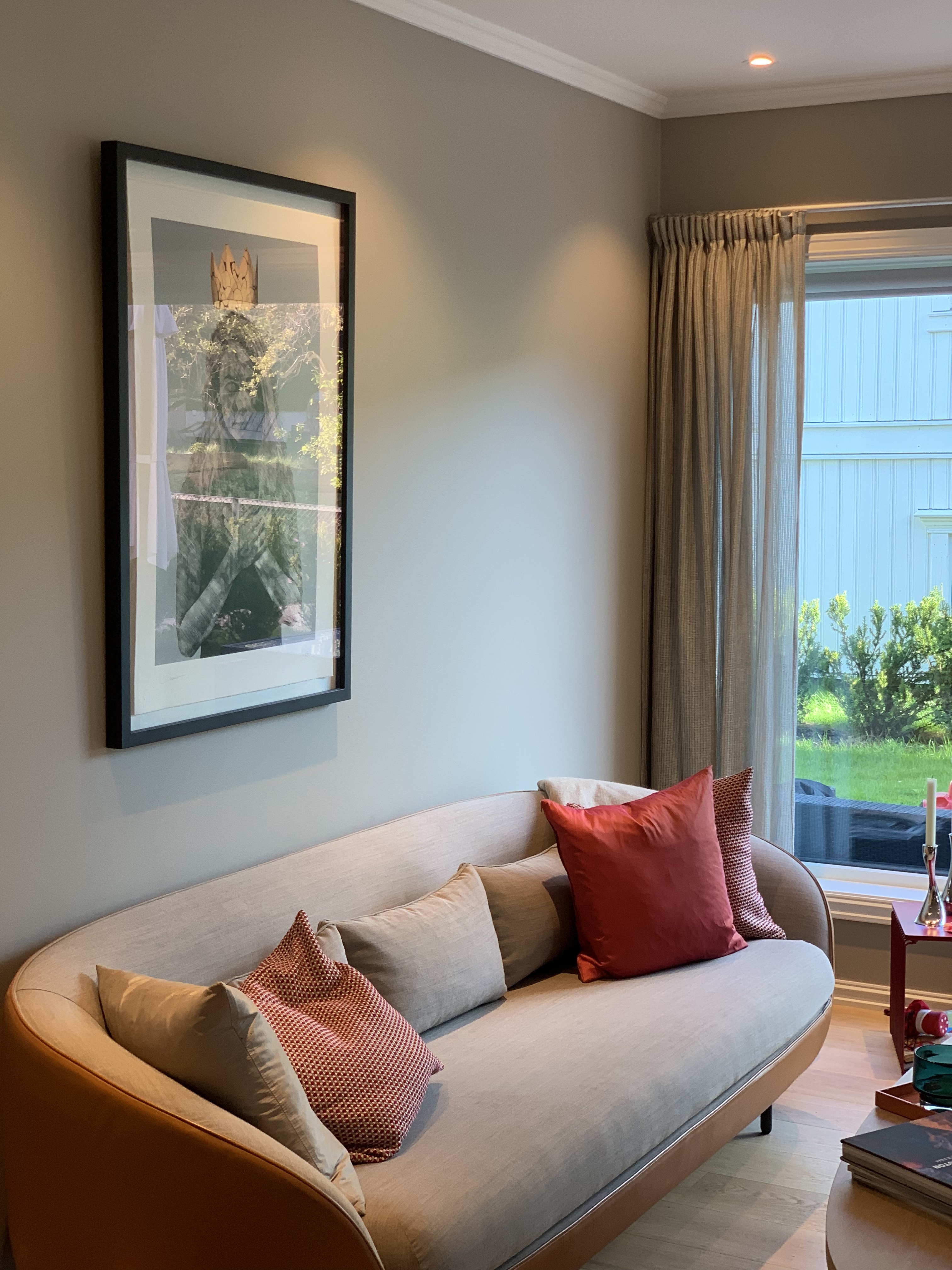 Det er et vindu bak og her er bilder med gardiner trukket fra og til. Står både rett foran bilde og litt på siden og helt på siden