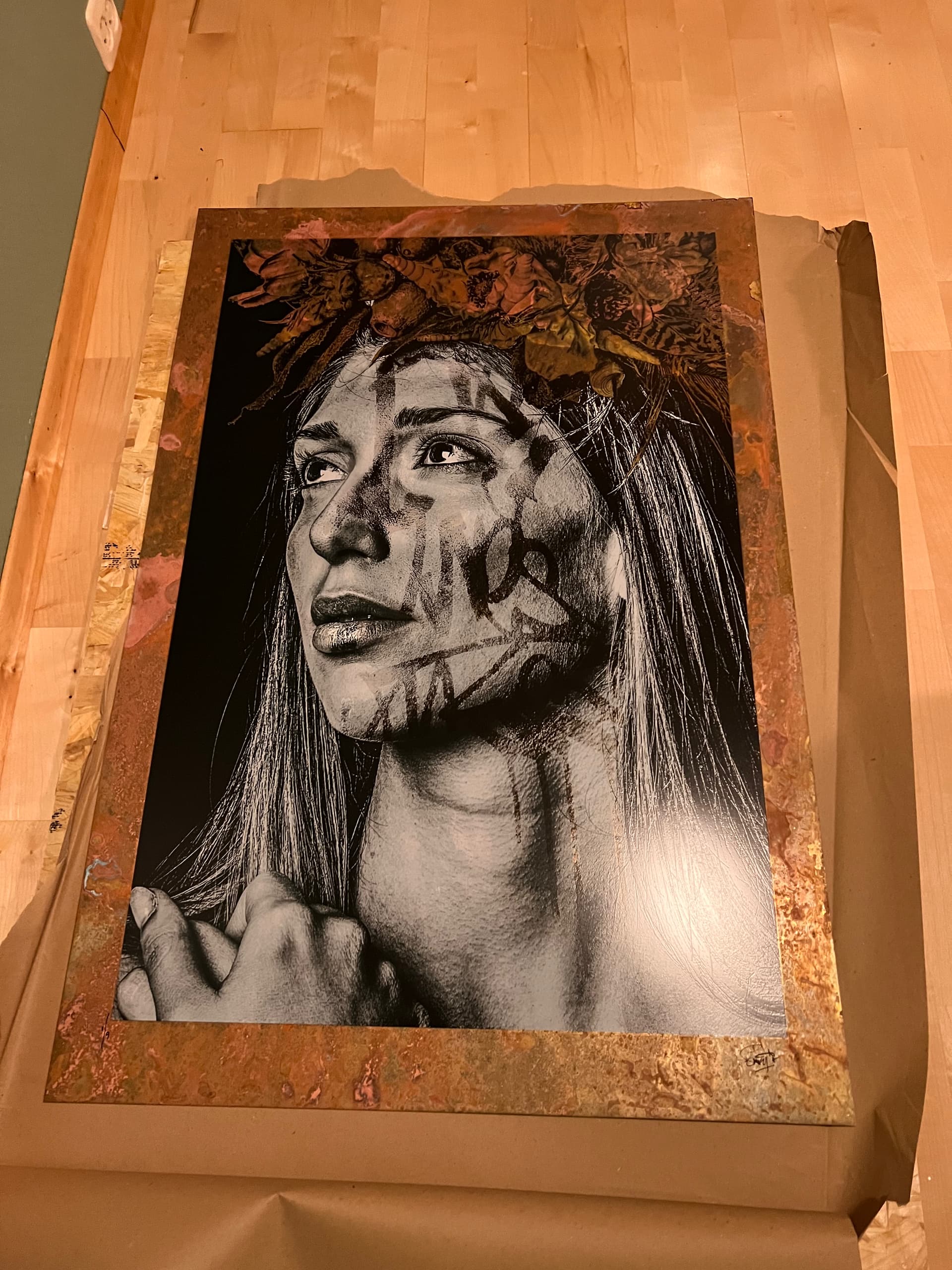 Teknikk: 6 Colour Screen Print on 1mm corroded brass all unique due to patina on the brass.