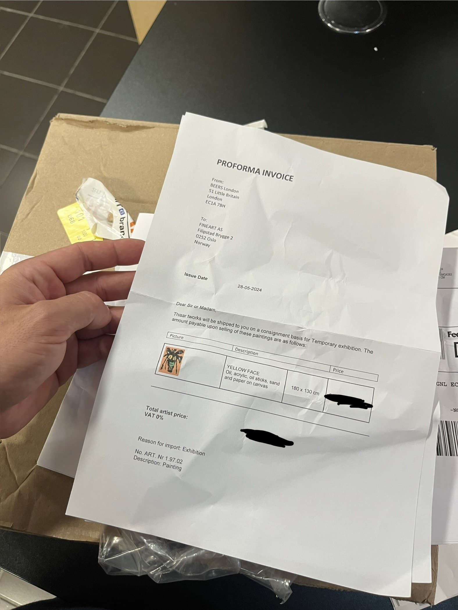 Jeg opplevde noe lignende i fjor da jeg kjøpte et maleri fra Beers i London og skulle få det fraktet til Oslo. Underveis endret pakken plutselig vekt, og i stedet for maleriet fikk jeg levert en internettkabel(!!) – og med fraktpapirene til maleriet!