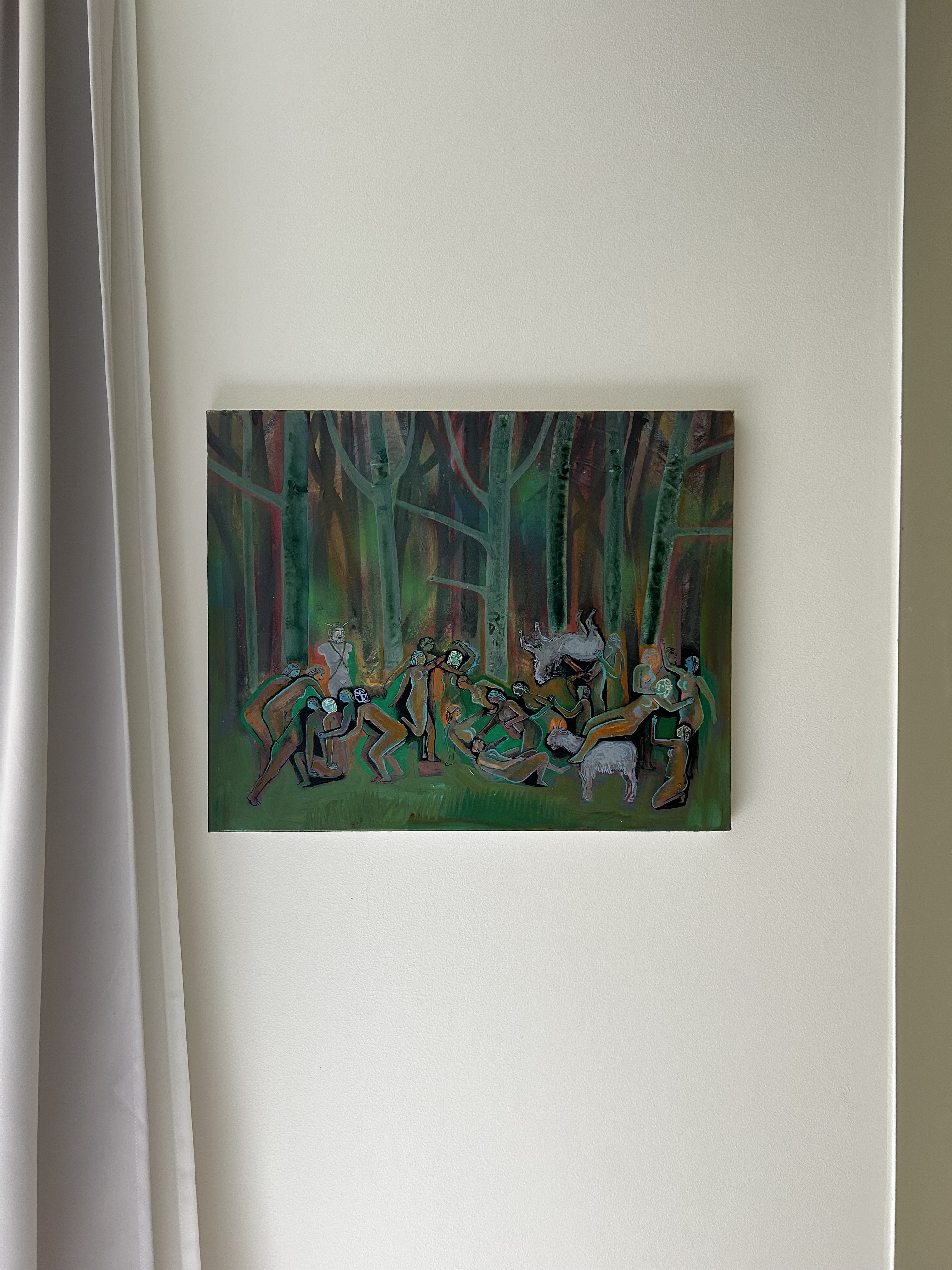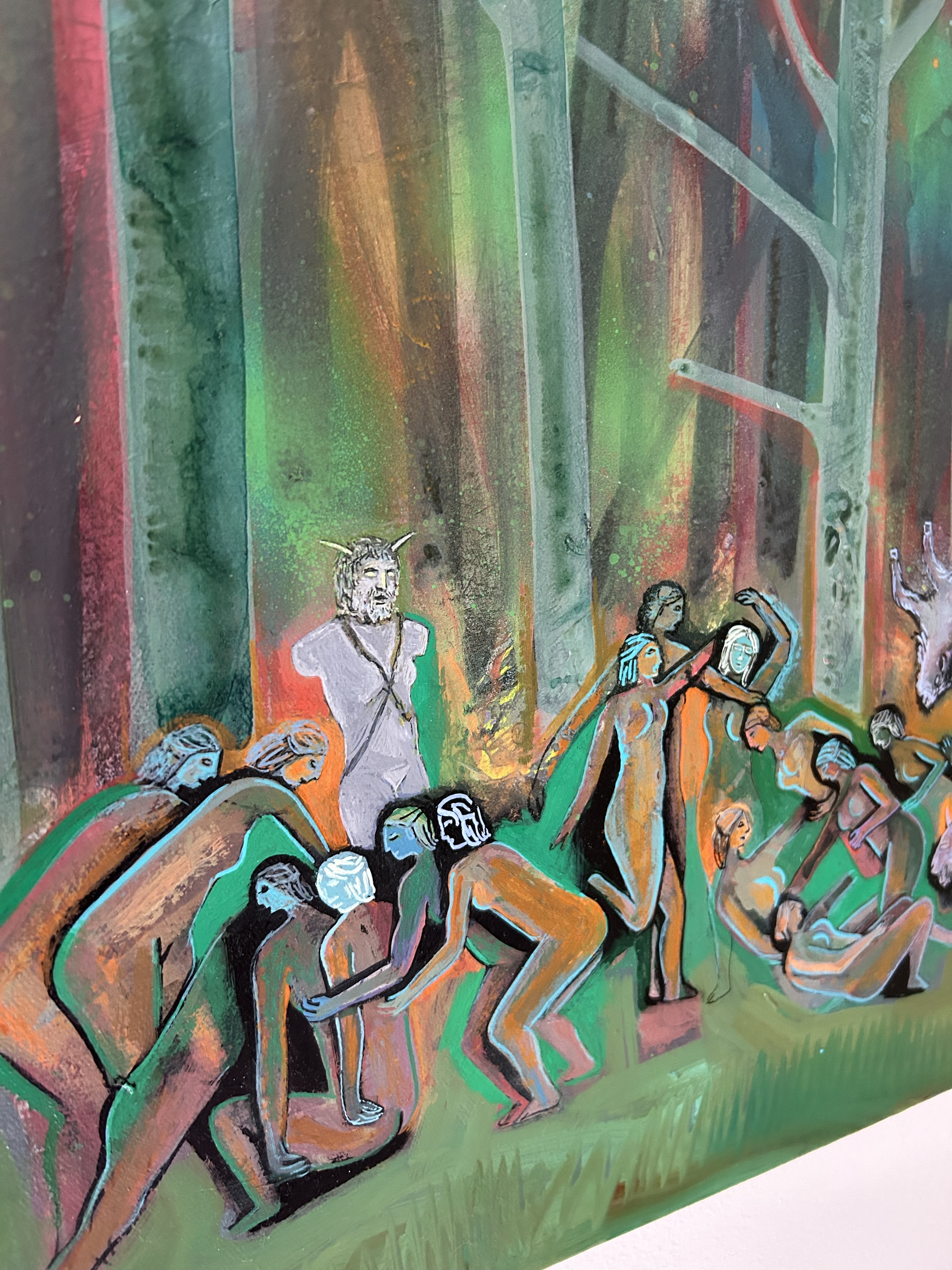 Jennifer Coates – Bacchanal Before a Herm of Pan, 2021. Acrylic and spray paint on canvas.