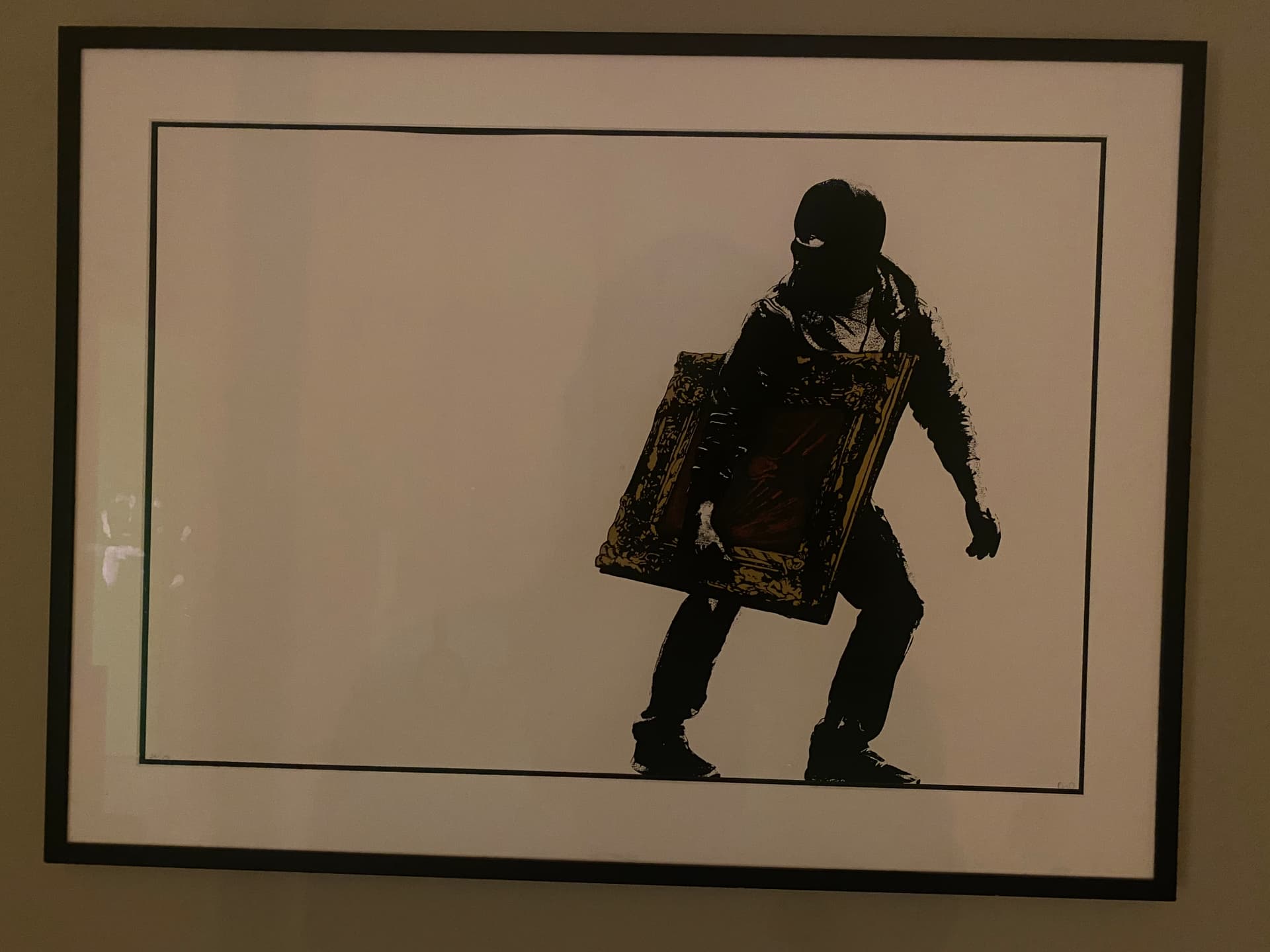 Bildet er rammet inn hos Rammeservice i Bergen og har artglass. Full disclosure, bakplaten/presset på rammen har løsnet litt, skal levere inn bildet iløpet av November for å fikse dette.