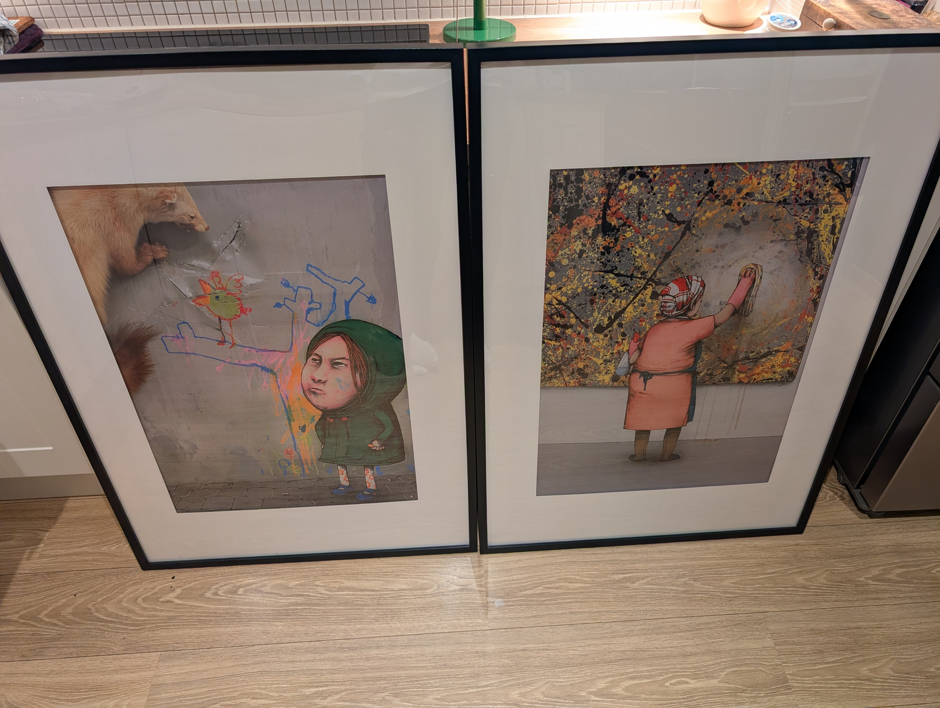 Kjøpte disse to stk Dran trykkene her for en del år siden 1000/trykk (?) og de har gjort sin misjon hos oss. De er tapet opp med vanlig tape på baksiden, ikke acid free. Ikea rammer. 50x70cm. Flytting her, noen som kan anslå verdi? Kjøpe?