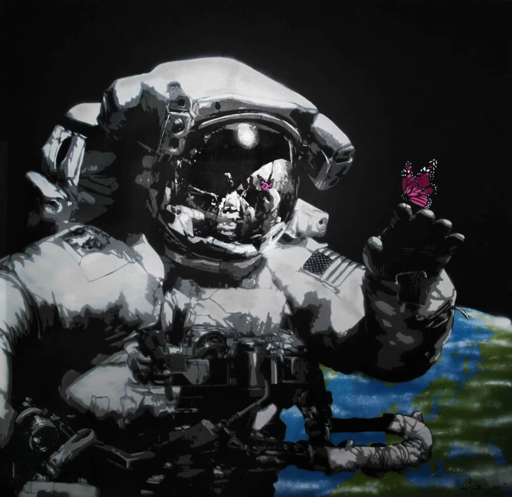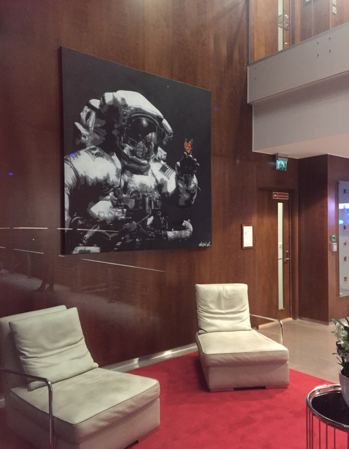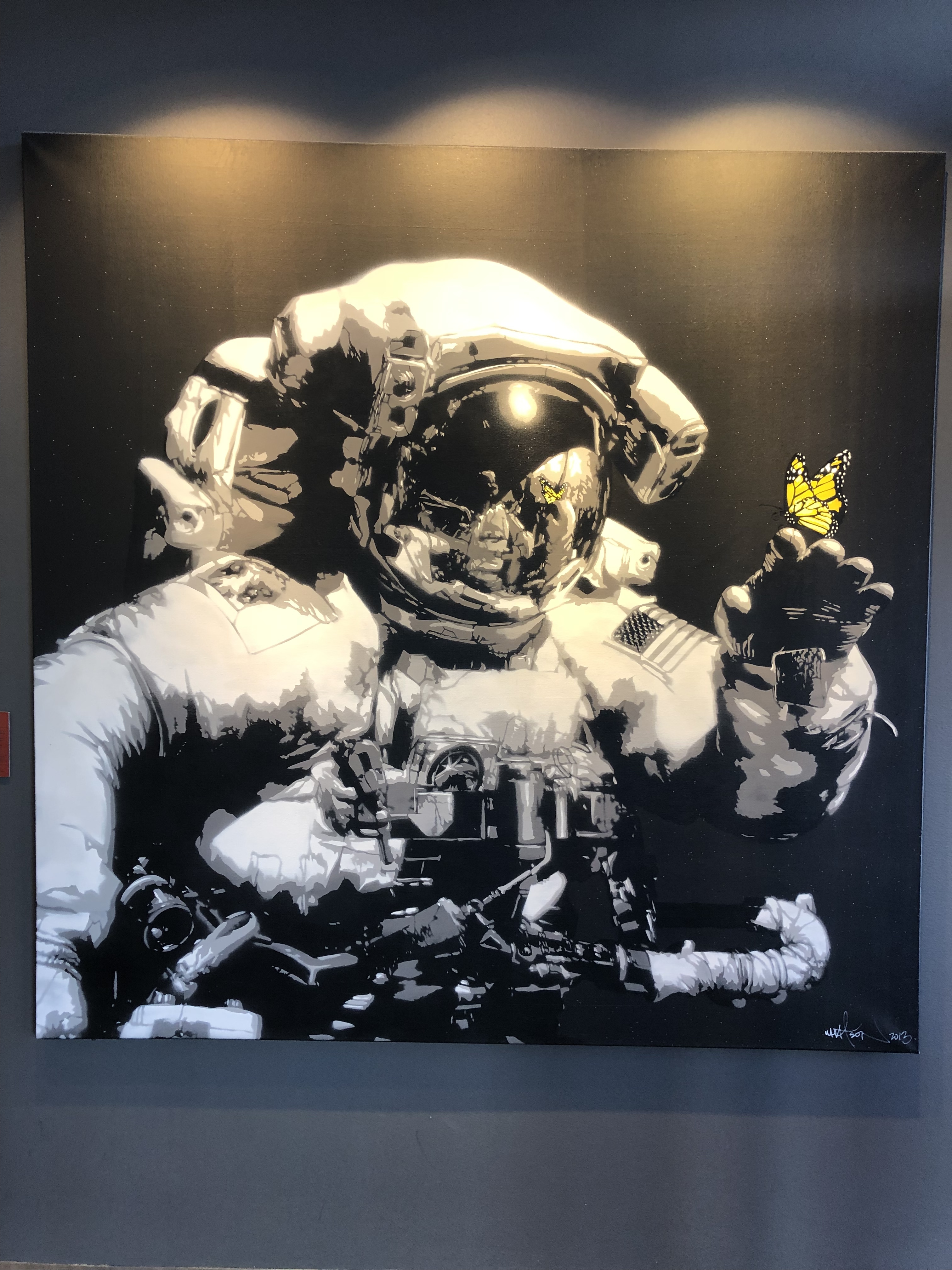 IMHO er aluminiumsversjonene i en helt annen liga, da den matte astronauten nærmest svever på pianolakken… Jeg er selvfølgelig alt annet enn nøytral da én av disse alu-versjonene henger på veggen her hjemme. Når jeg så ovennenvte link, så hoppet jeg i bilen og kjøpte det umiddelbart… Her et lite bilde fra seansen.