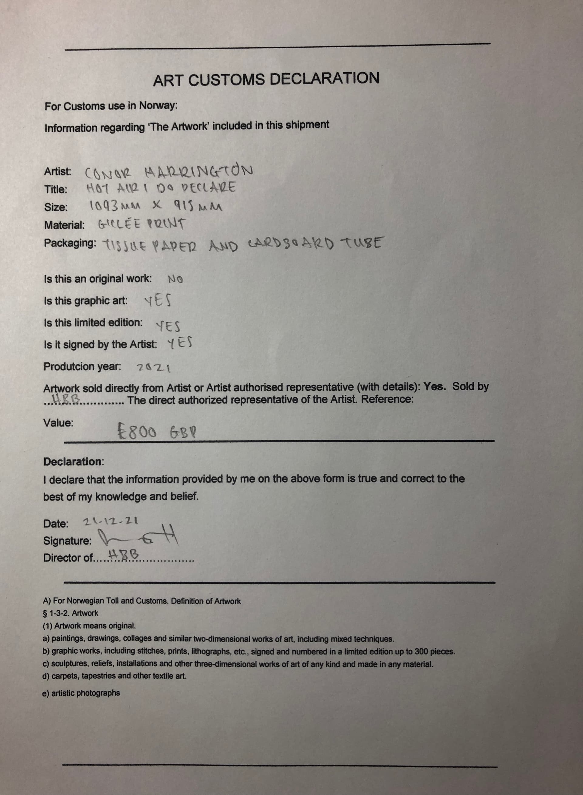 Hei! Jeg kjøpte verk fra statene som ble fortollet av posten feilaktig - for å korrigere i dette sendte jeg ordrebekreftelse + all informasjon som sto om trykket. Det viktigste er at det tydelig fremgår at du har kjøpt av enten kunstneren selv (som lever) eller av en direkte formidler. Antar du har kjøpt gjennom en formidler? Og at hvis du mangler informasjon om opplag osv. så har de den informasjonen. Men for meg var det tilstrekkelig med ordrebekreftelse + all informasjon.