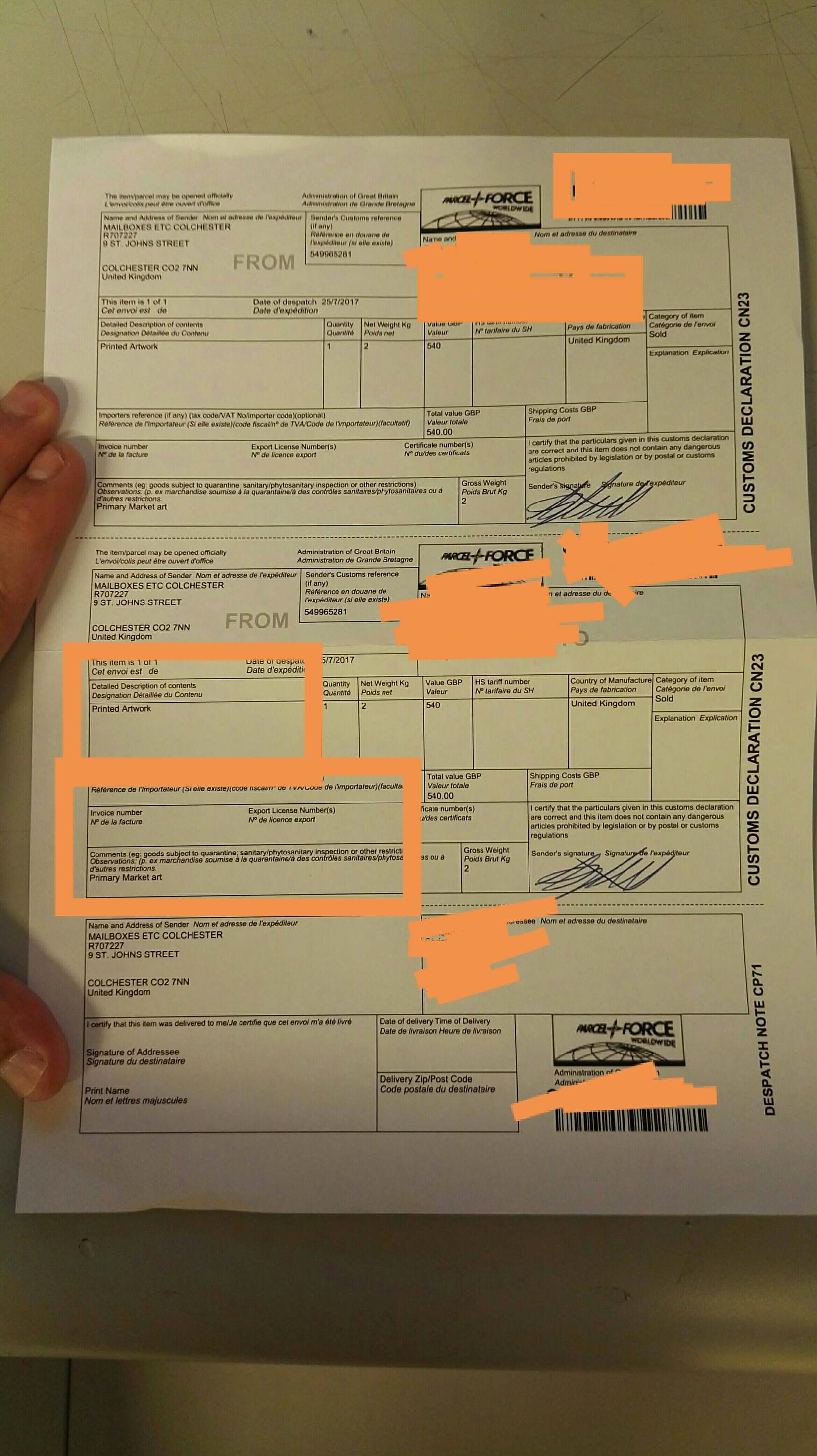 Har nå fått sendt inn ny commercial invoice + en underskrevet “art declaration” fra Invader som forhåpentligvis burde være tilstrekkelig. Venter nå på svar fra FedEx.