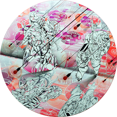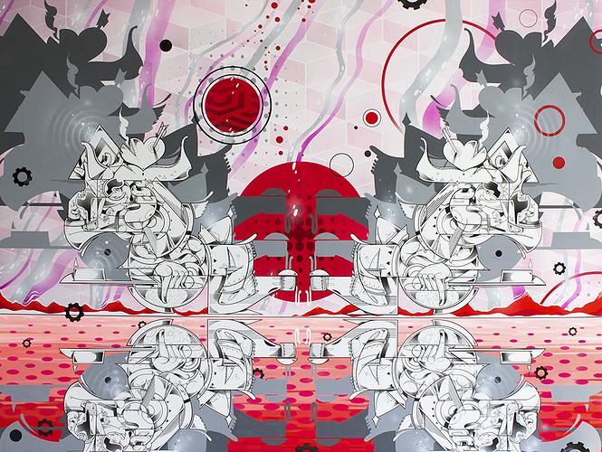 How & Nosm, the twins from Brooklyn, are tackling Detroit in two ways this week. First they are painting a massive mural downtown, and second they will be showing a new body of work at Library Street Collective called “In Between.” From the gallery, “Often referencing themes of dichotomy and duality, twin brothers Raoul (How) and Davide (Nosm) Perre will examine the struggle for balance in this exhibition of intricate works on canvas and paper, taking their exploration of opposites to places of mediation.”