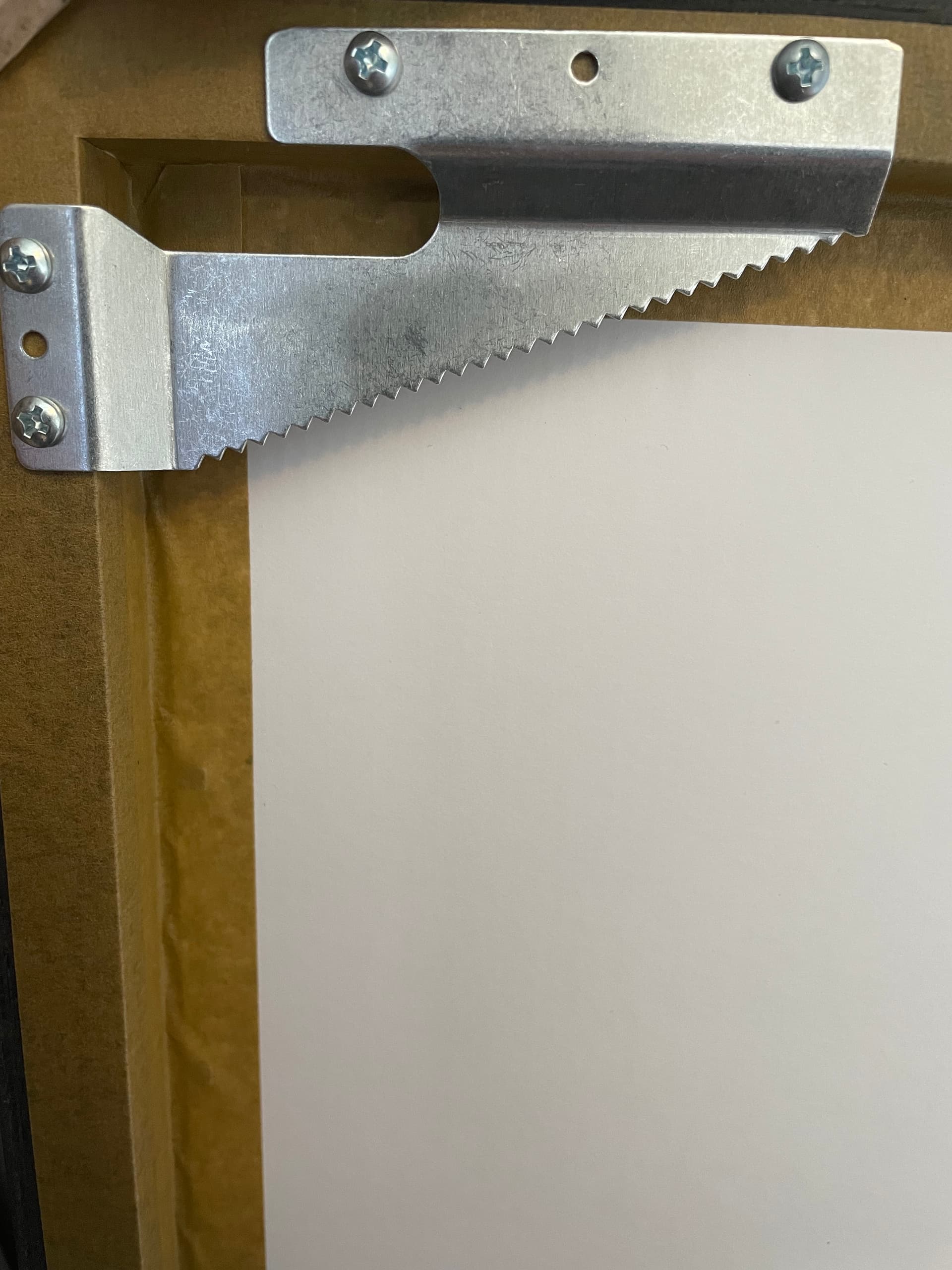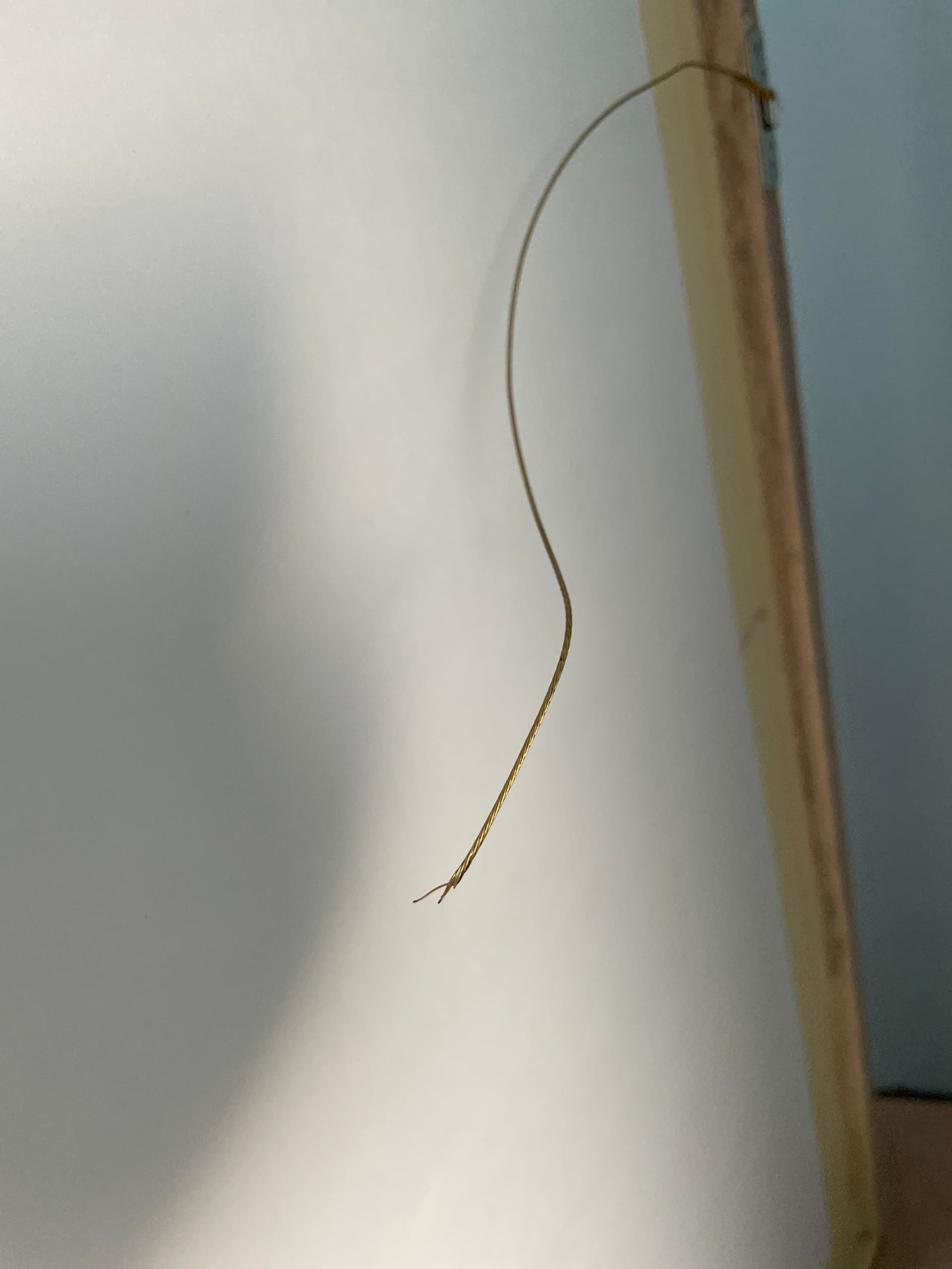 Husker en gang rammemakeren sa til meg om å være forsiktig med justeringen av bildet dersom jeg brukte skruer til oppheng. Gjengene gnager sakte men sikkert i wiren og kan til slutt ryke. Jeg ser på mange av mine innramminger er det et slags plastbelegg utenpå wiren og sikkert for begrense slikt. Jeg har også på et par andre surret litt elektrikertape el akkurat der wirene ligger på skruen/opphenget for å ha litt å slite på.