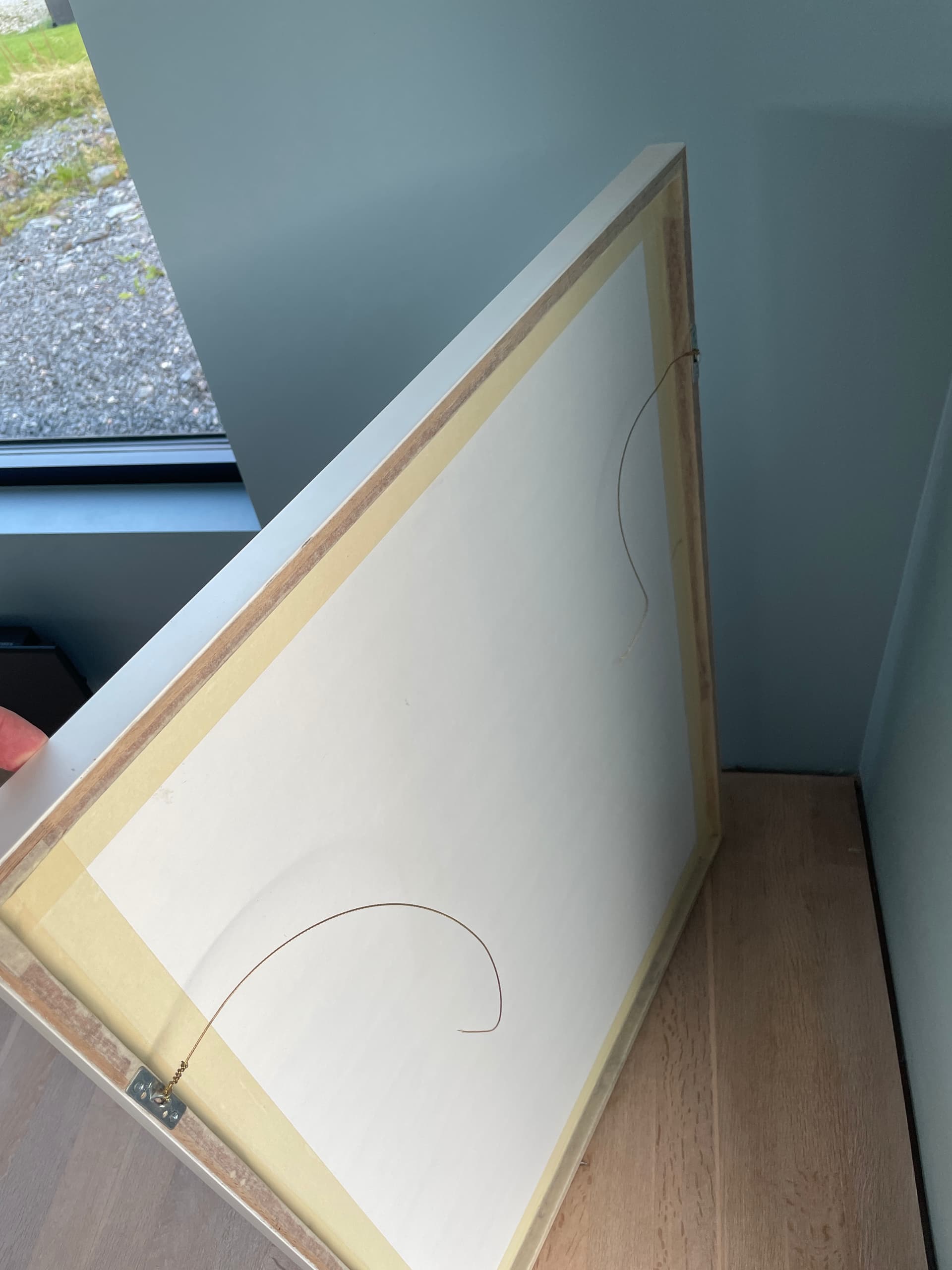Vaieren som stikker ut i bunn, kan du teipe på veggen bak bildet. Henger du flere mindre bilder på samme vaier, så kan bildene flagre litt. Trikset da er å teipe vaieren til veggen på baksiden av hvert bilde. Da holder de seg inntil veggen.