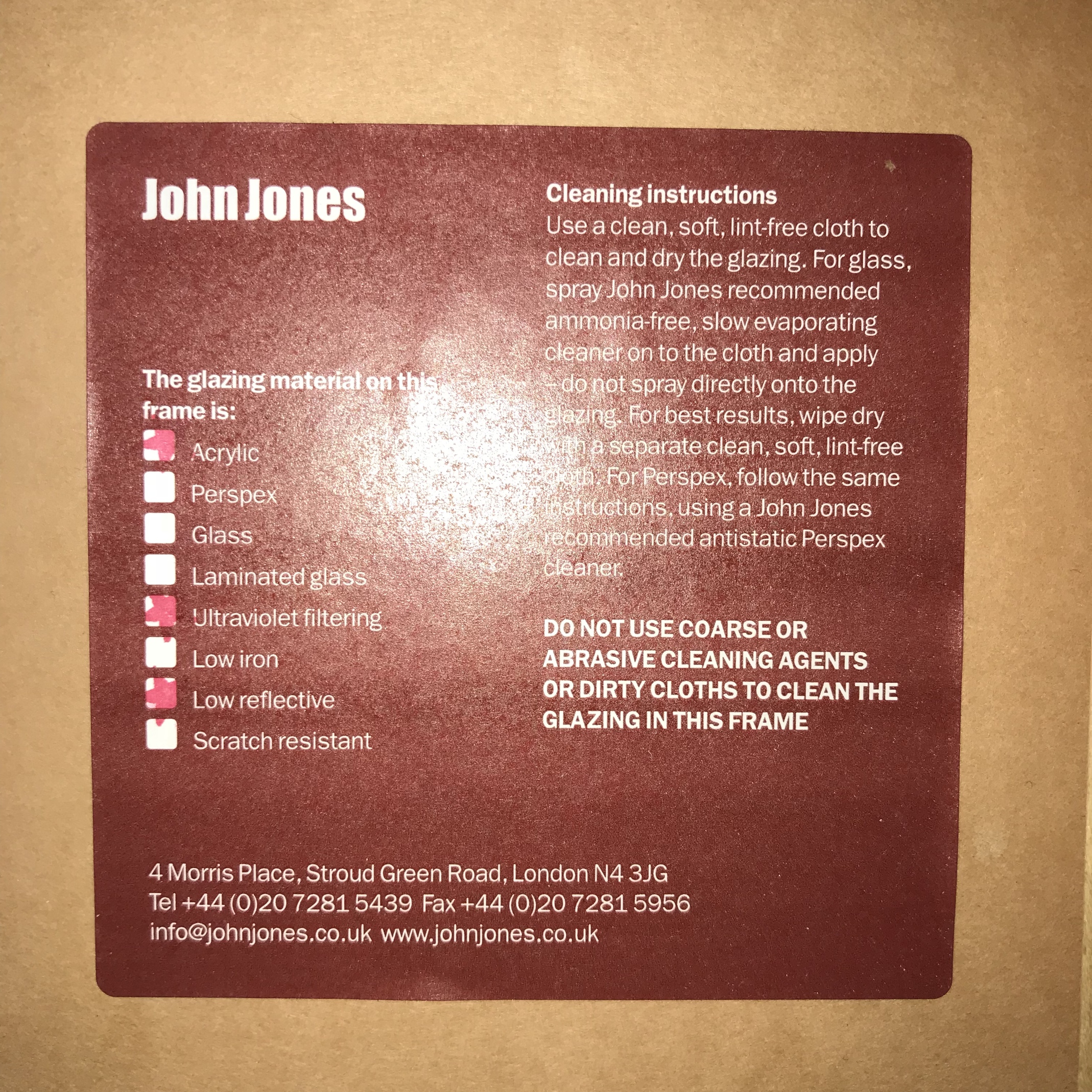 Hvis du velger å ramme inn med passepartout så gjøres det best ved å benytte syrefrie monteringshjørner som benyttes for de to nederste hjørnene og kun for det ene øverste hjørnene. Dette for at papiret skal kunne bevege seg fritt pga endringer i temperatur og fuktighet. Ref John Jones, London.