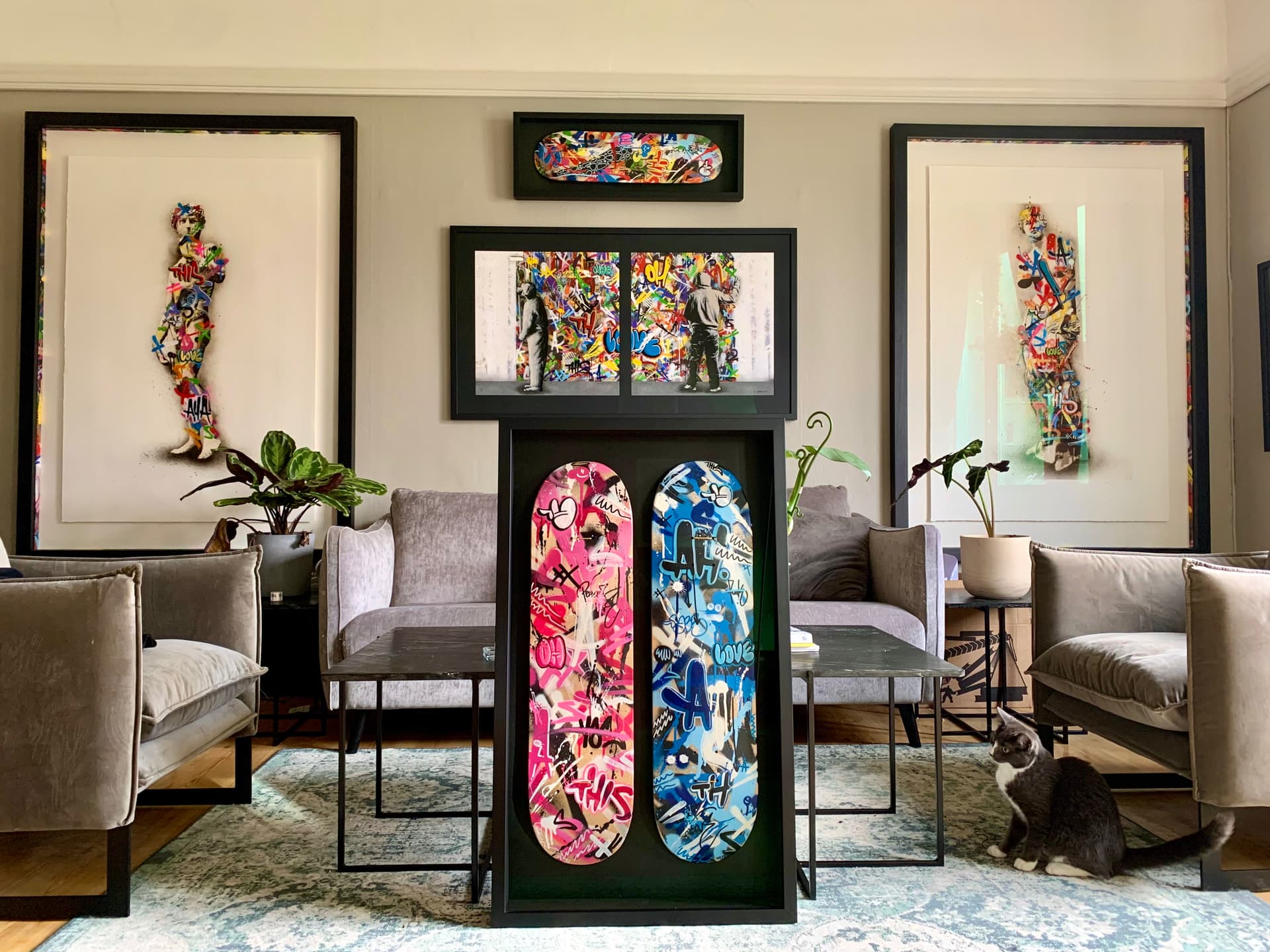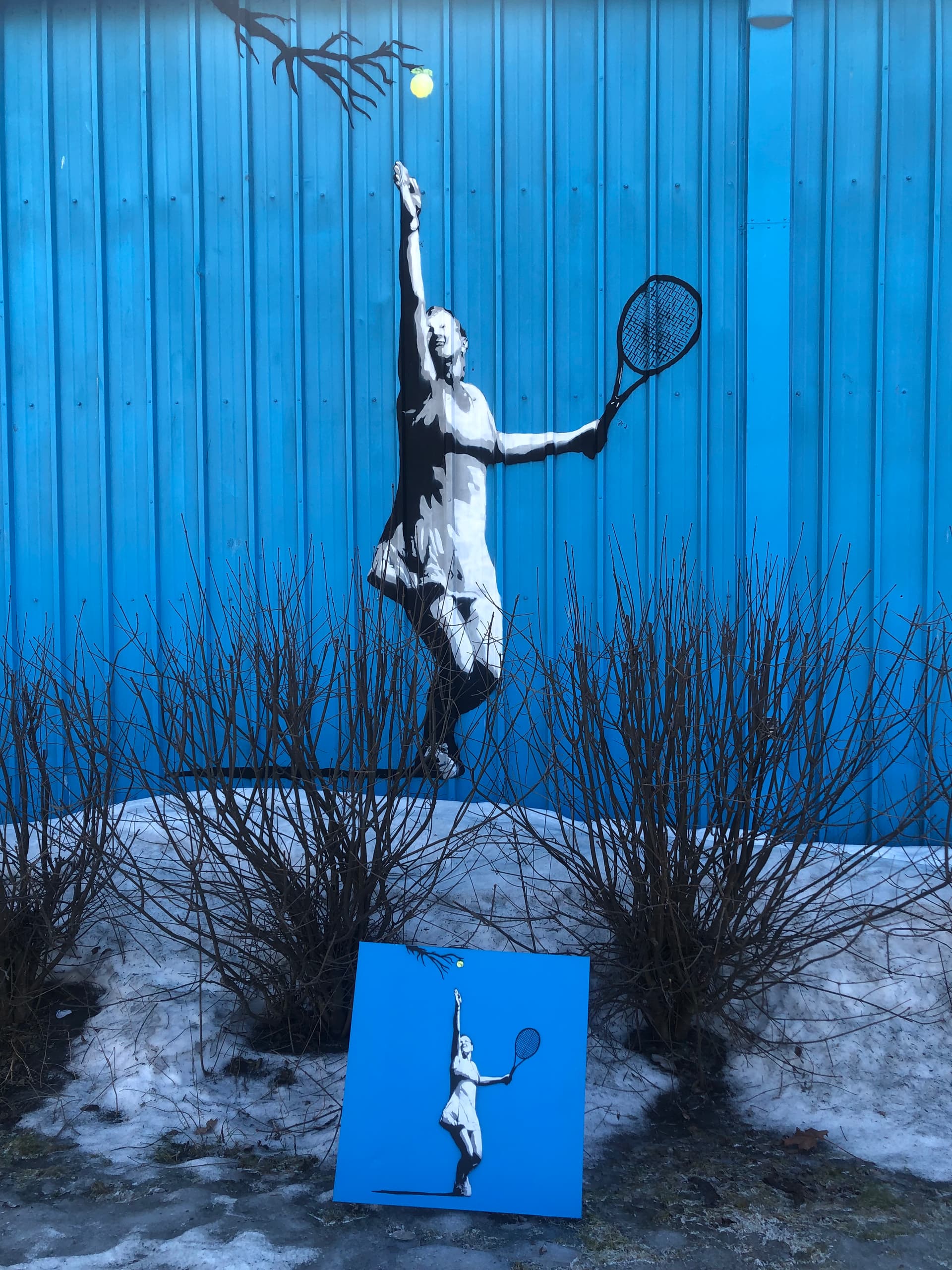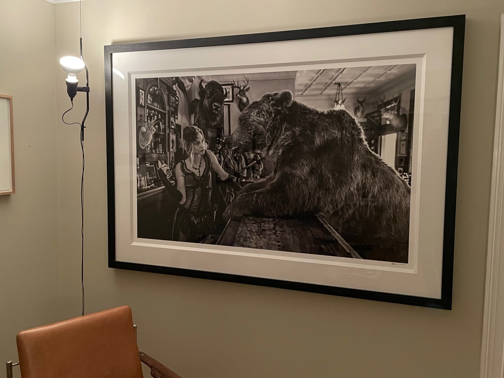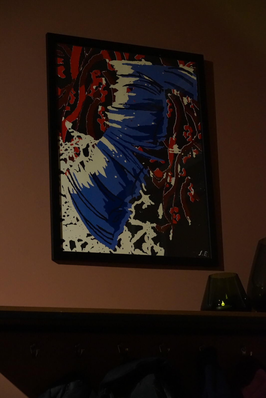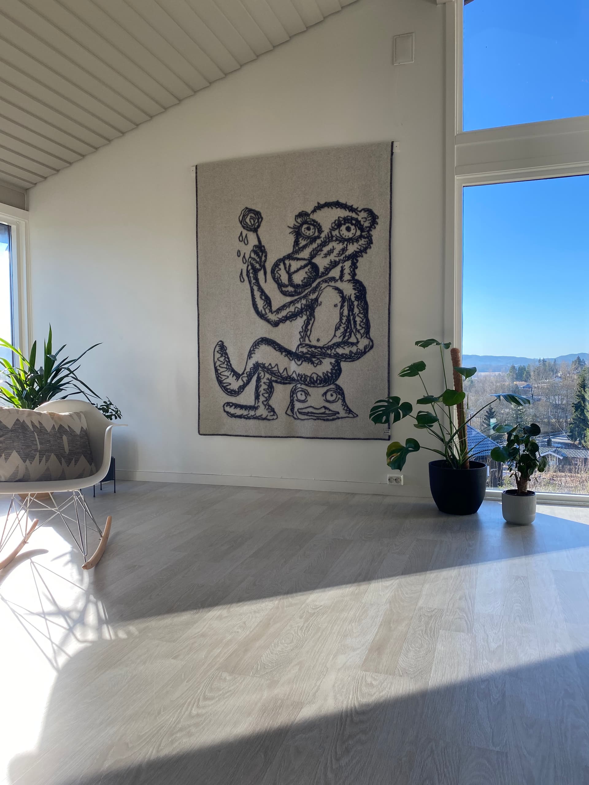 Samboeren ønsker seg blomster til bursdagen. Bestemte meg for å tolke det litt fritt… Kjøpte derfor et gedigent ullteppe med «panter’n» av Melgaard (som tross alt holder en blomst) og hang det på veggen.