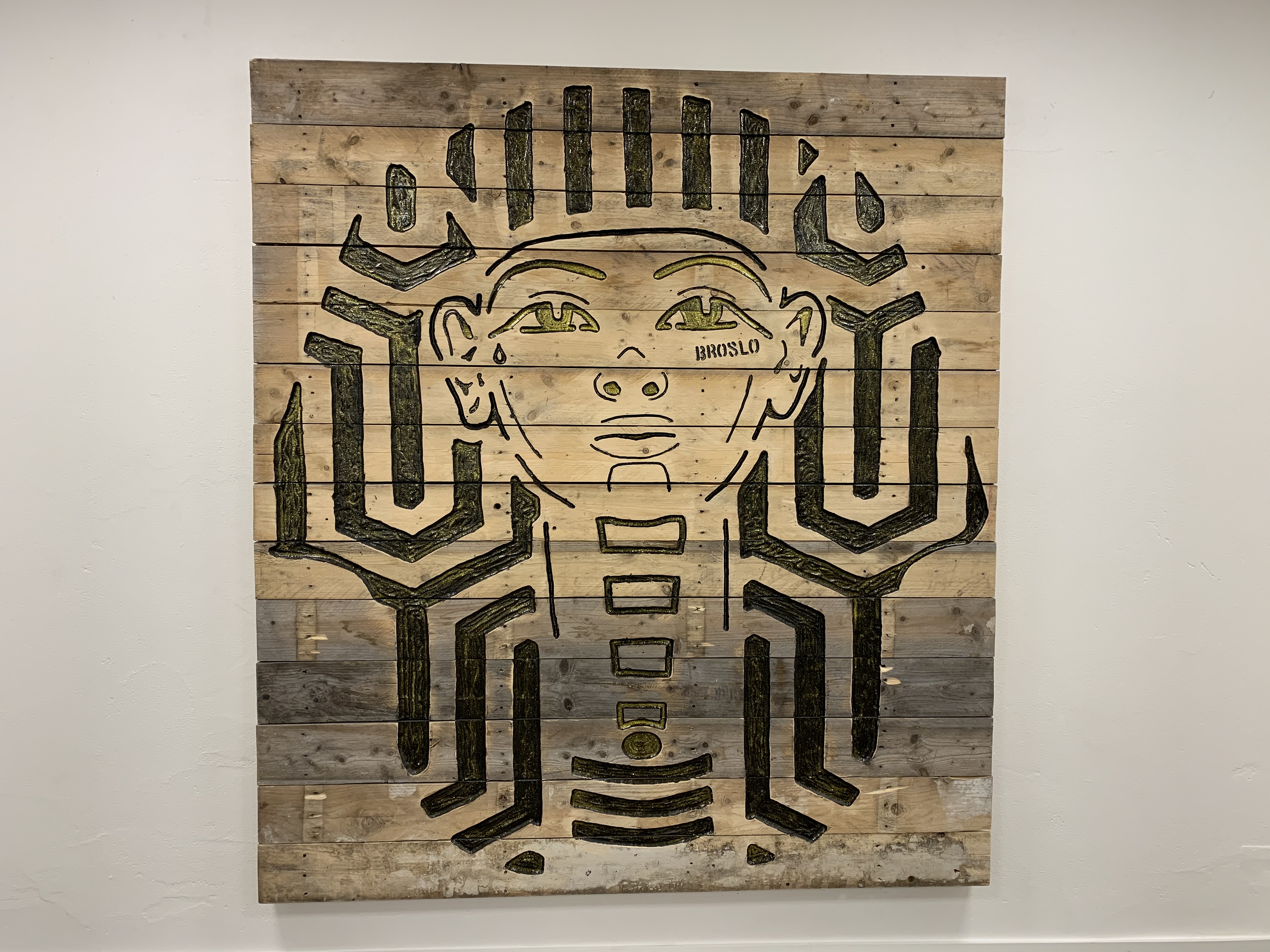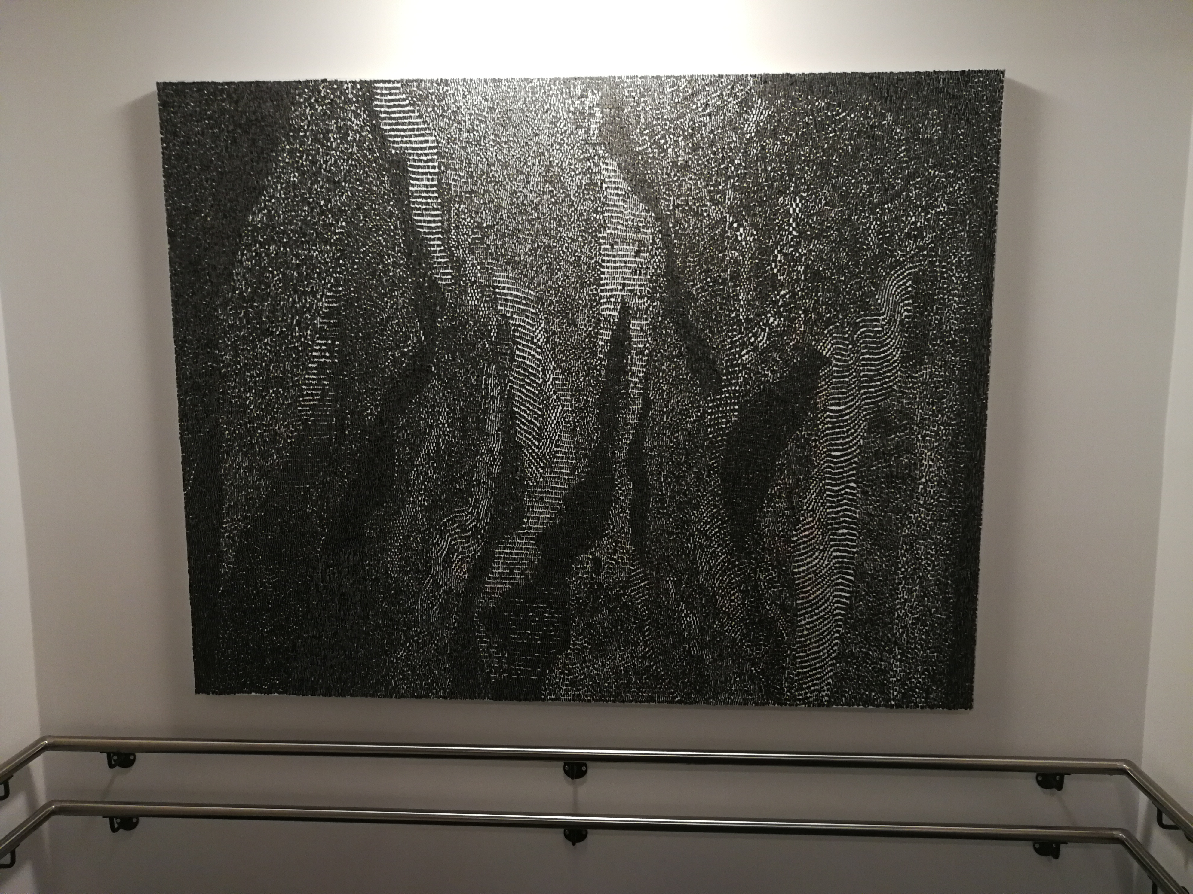 Fader altså, jeg skulle tatt bilde av en annen som hang der. Det var et bilde som var laget av rullede 1 dollar sedler plassert i perfekte rader og kolloner. I midten var noen av dollarsedlene kuttet slik at man kunne se hylsen som seddelen var rullet rundt og det dannet en åpning i bildet som det stod ONE på. Fet, mener at det har vært omtalt her tidligere.