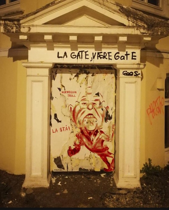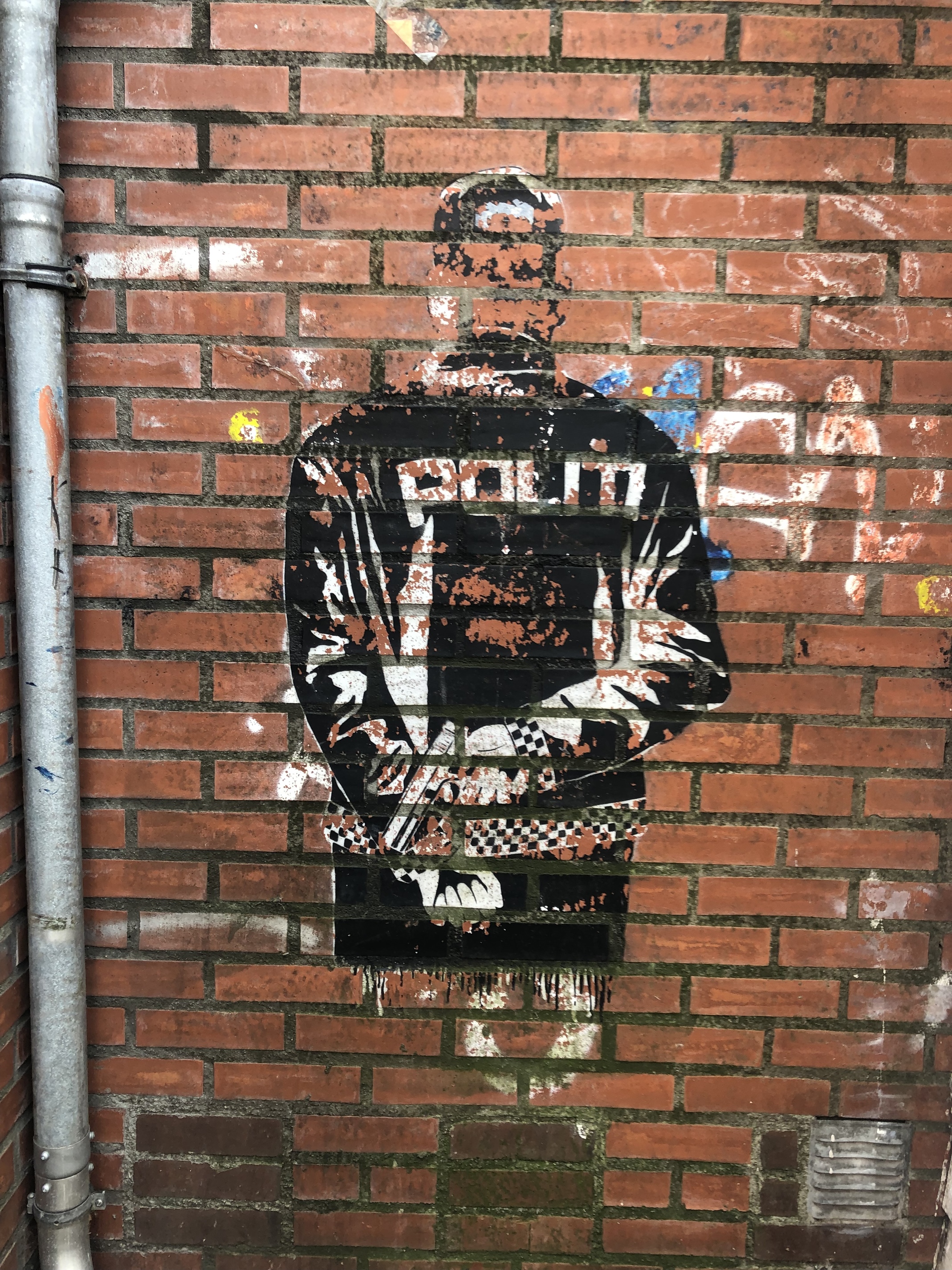 17 mai. Verdens fineste sådan får du i byen mellom de syv fjell. Ferdig snakket. Dette er også en by som kan by på svært mye spennende gatekunst. Som de fleste av dere har fått med dere. En av de vi oppdaget på vår jakt etter noe mat var denne. Politi. Med en pistol gjemt bak ryggen. Klarer ikke å se hvem som har laget den, men er da i gågaten Marken like ved bergen politikammer.