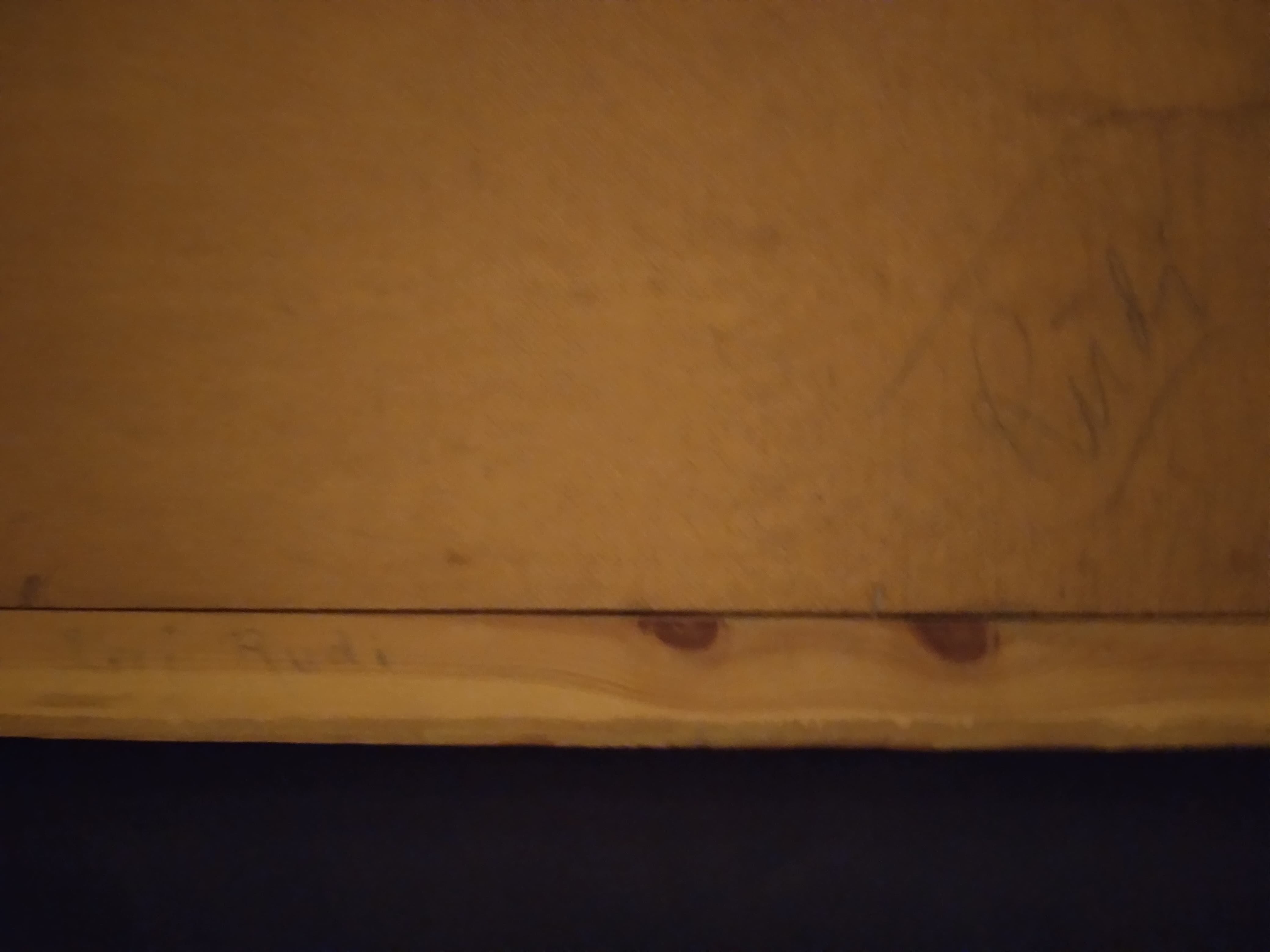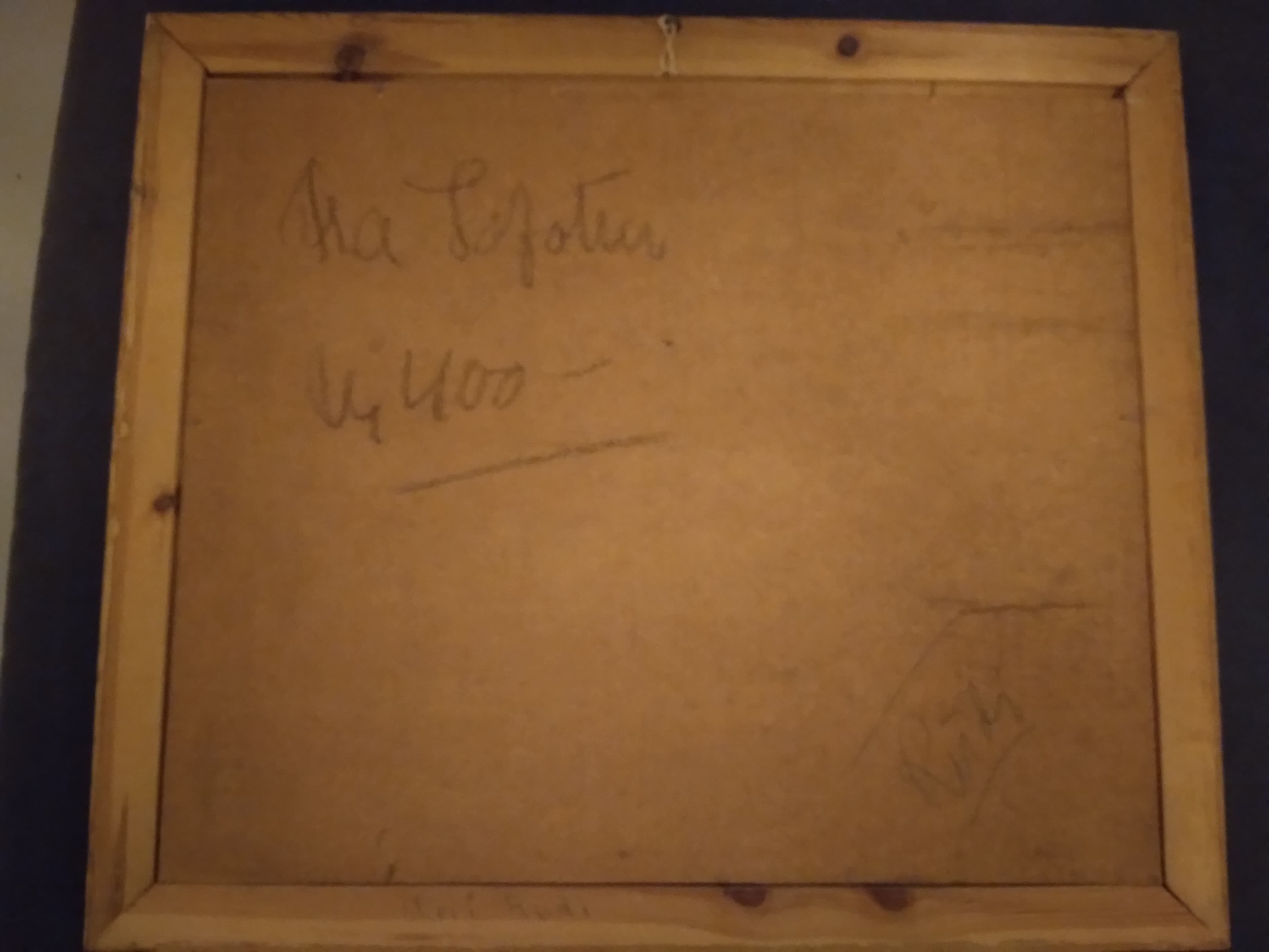 Bak pĂ„ maleriet er skrevet âFra Lofotenâ, 'kr 400,-" og âLeif Rudiâ. Sistnevnte er kjĂžperen av bildet (bildet fulgte med et bo jeg overtok deler av), en skipsmegler, og senere -reder, fra Trondheim, som blant annet ogsĂ„ var ordfĂžrende mester i frimurerlosjen i byen.