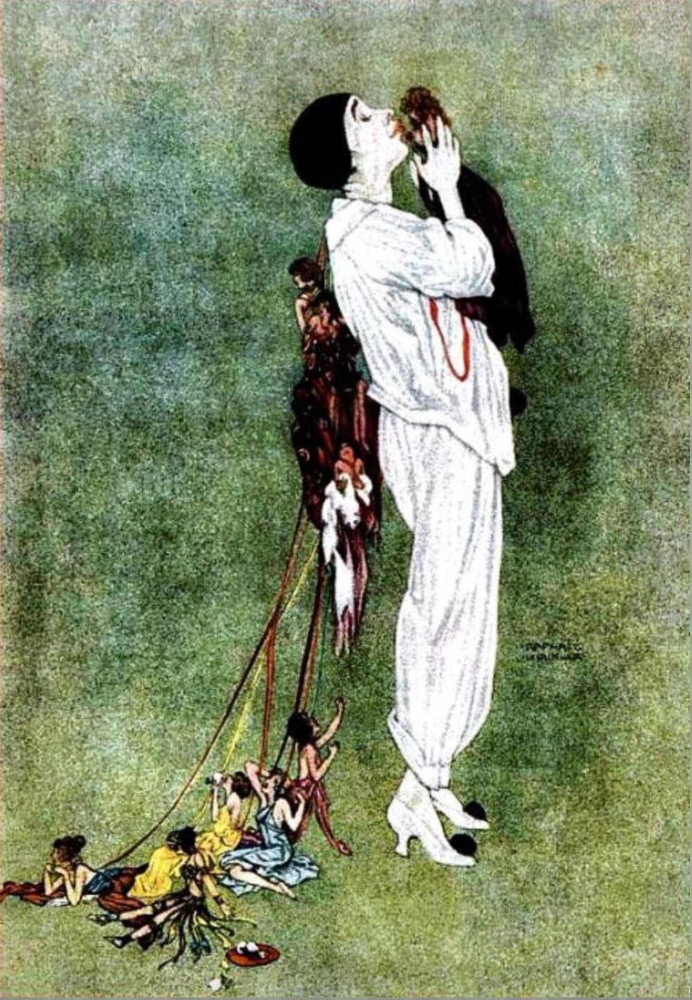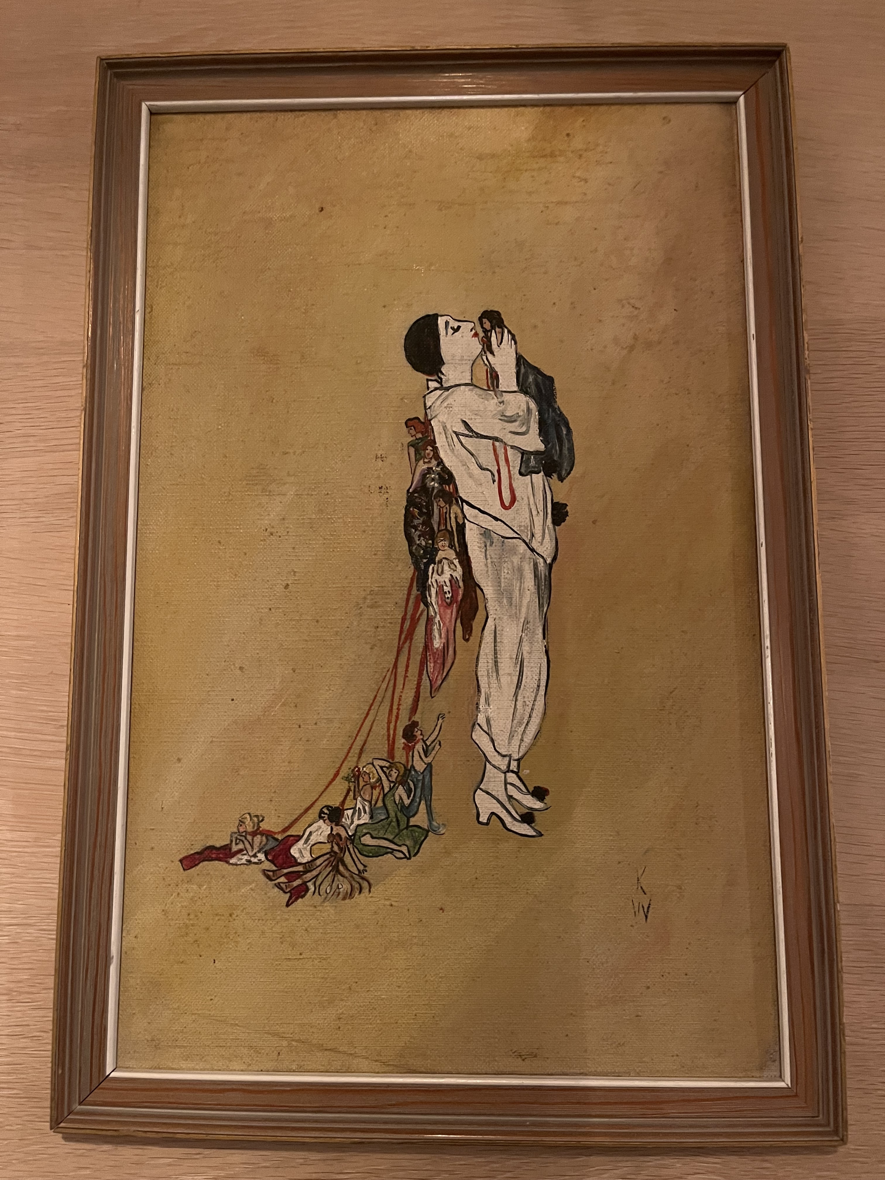 Siste bilde er mere spennede, det er i art nouveau stil og en kopi malt av noen med initialene K.W - det opprinnelige bildet er av den Ăsterrikske maleren og illustratĂžren Raphael Kirchner 1875-1917 med tittelen Les amours de pierrot fra ca 1905-1917. Fint bilde men dessverre en kopi du har, av en av art Nouveau stilens fremste utĂžvere innen malerkunsten.