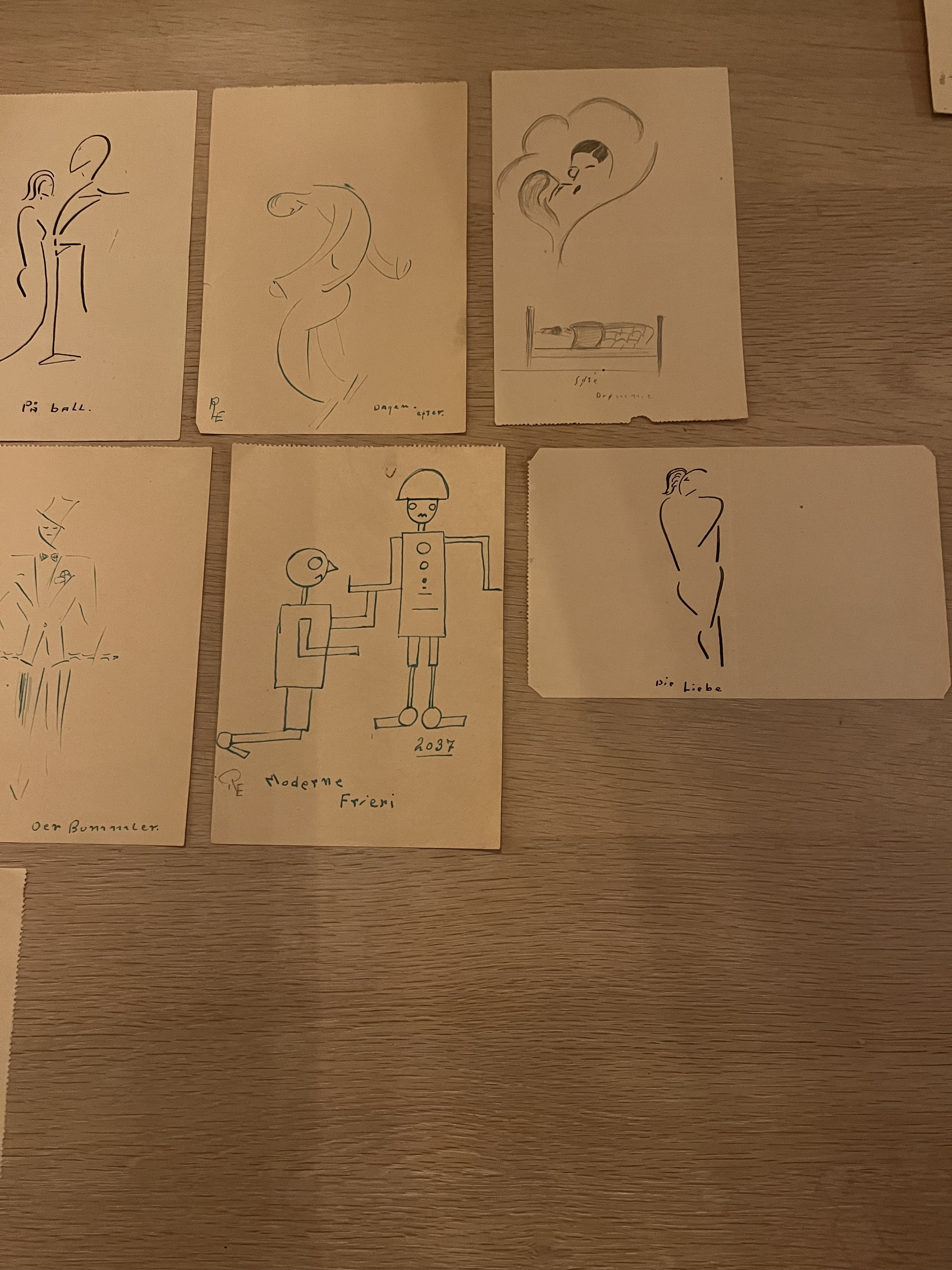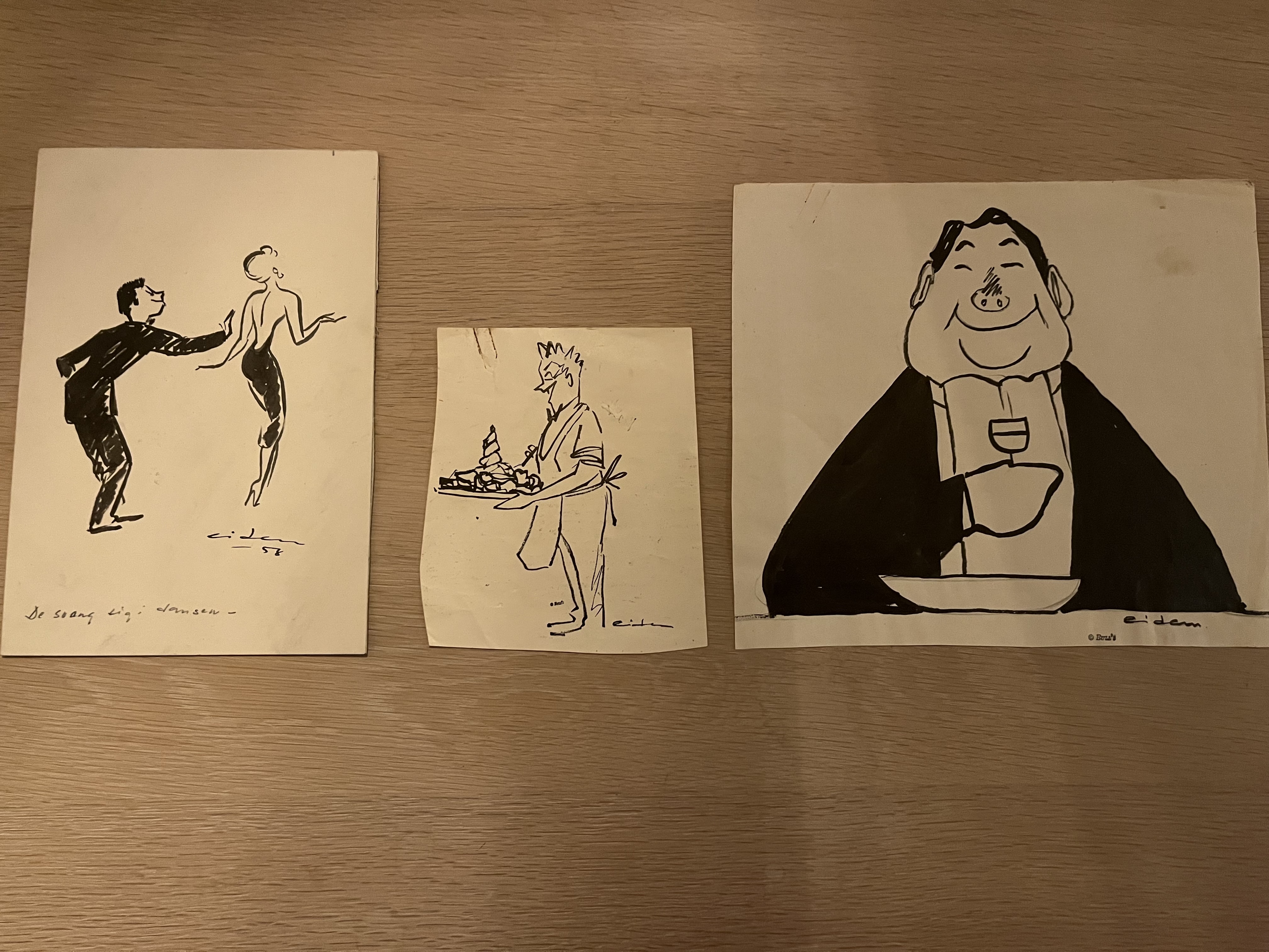 De tre tusj/blekk tegningene kan vÊre av Paul Lorck Eidem 1909-1992. Eidem var kjent i mitten av forrige Ärhundre for sine tegninger og bÞker fra resturant og nattklubber, bla bestselgeren En herre pÄ byen fra 1937. Han besatte et gammelmodig kvinnesyn sett med dagens Þyne og er et glemt navn i dag. Er litt vanskelig Ä se om det er han eller noen som har kopiert Eidems tallrike tegninger.