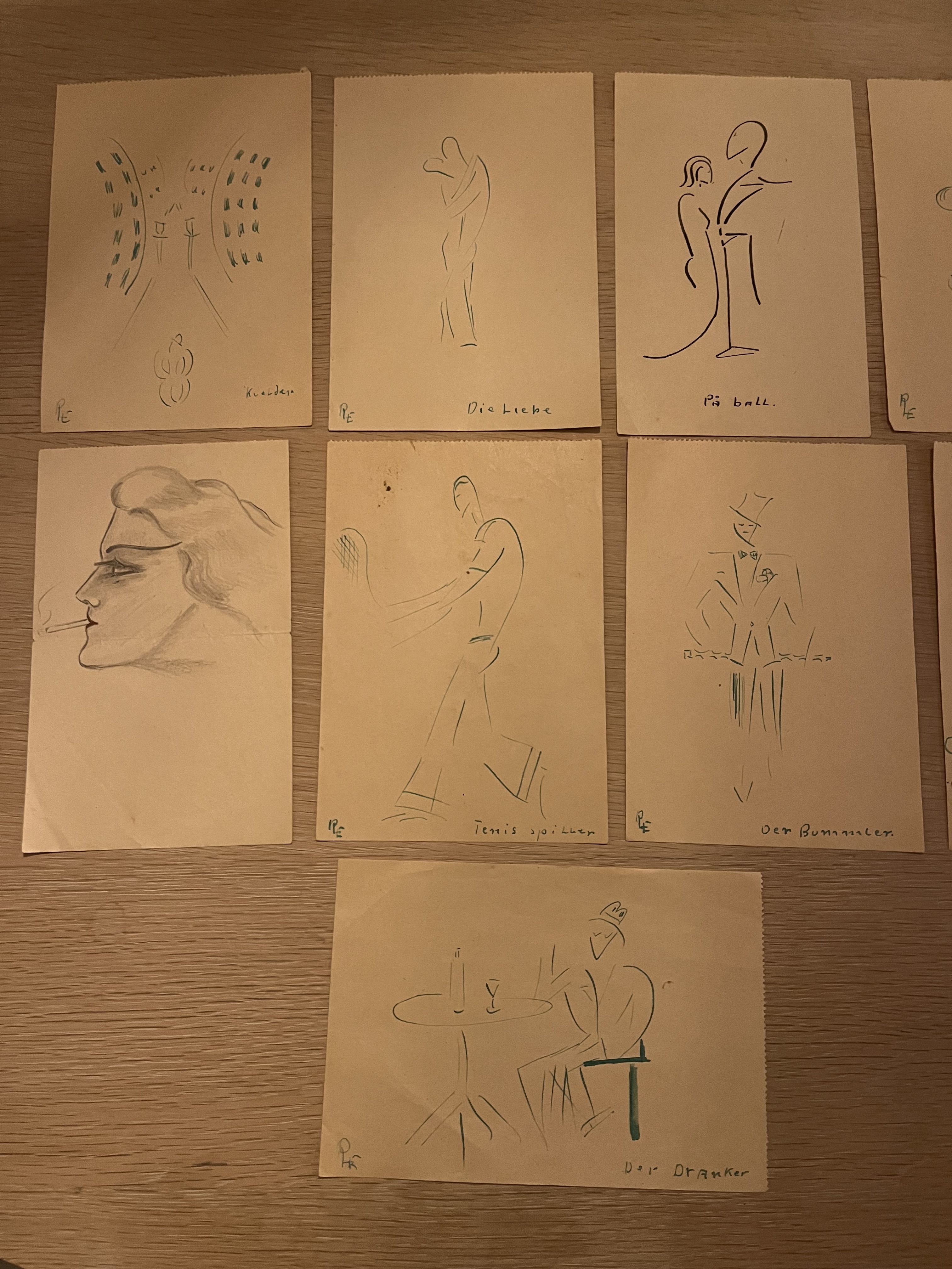 De tegningene signert R.E er formodentlig skisser til en illustratĂžr, reklameskole elev eller lignende.