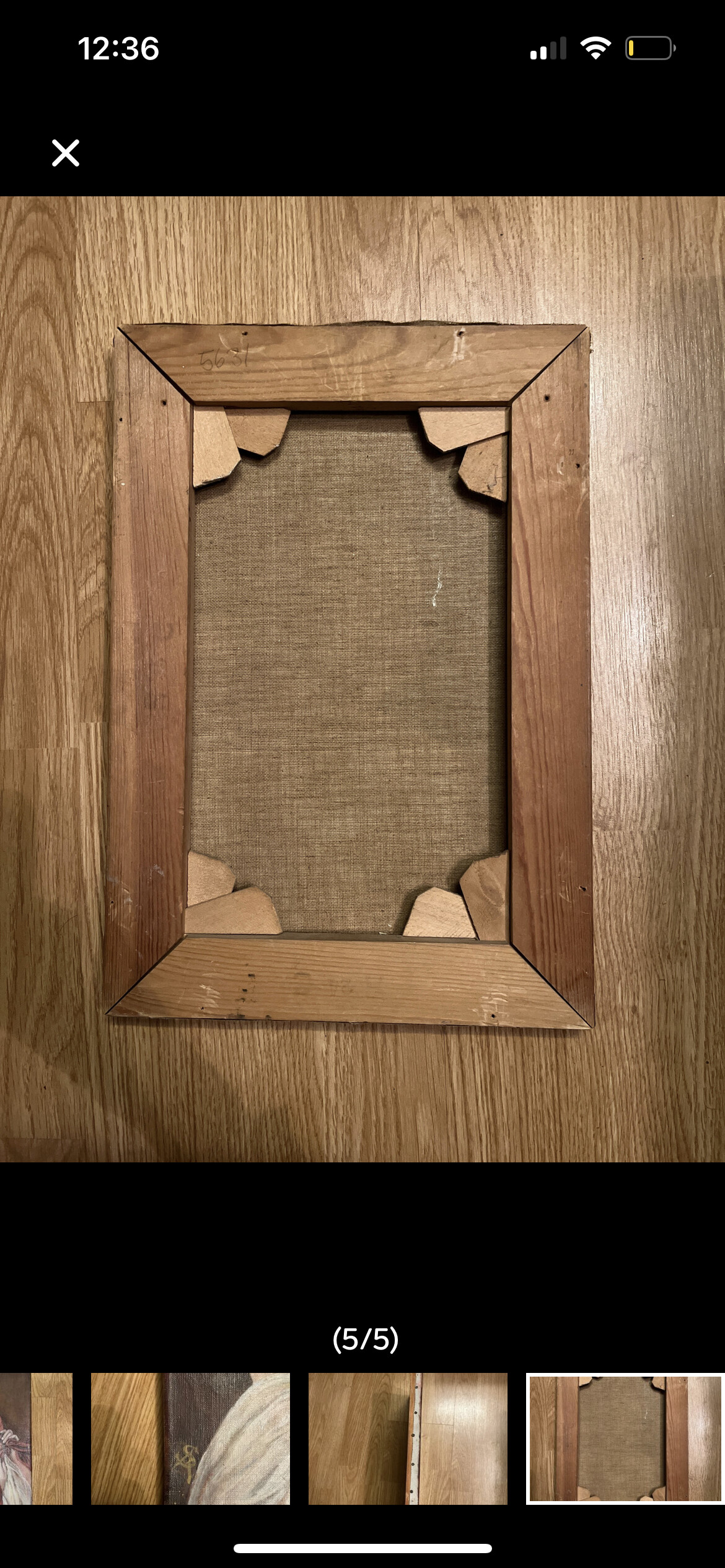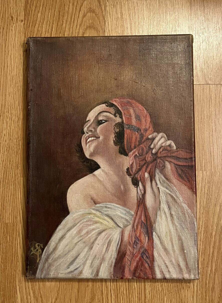 Hei jeg lurer pÄ om noen kan hjelpe meg med navn pÄ kunstner og prisantydning pÄ dette eldre oljemaleriet. Det er et kitsch og ligner pÄ stilen til sigÞynerkvinnen bilde. Omtrent mÄl er litt stÞrre enn et A4 ark.