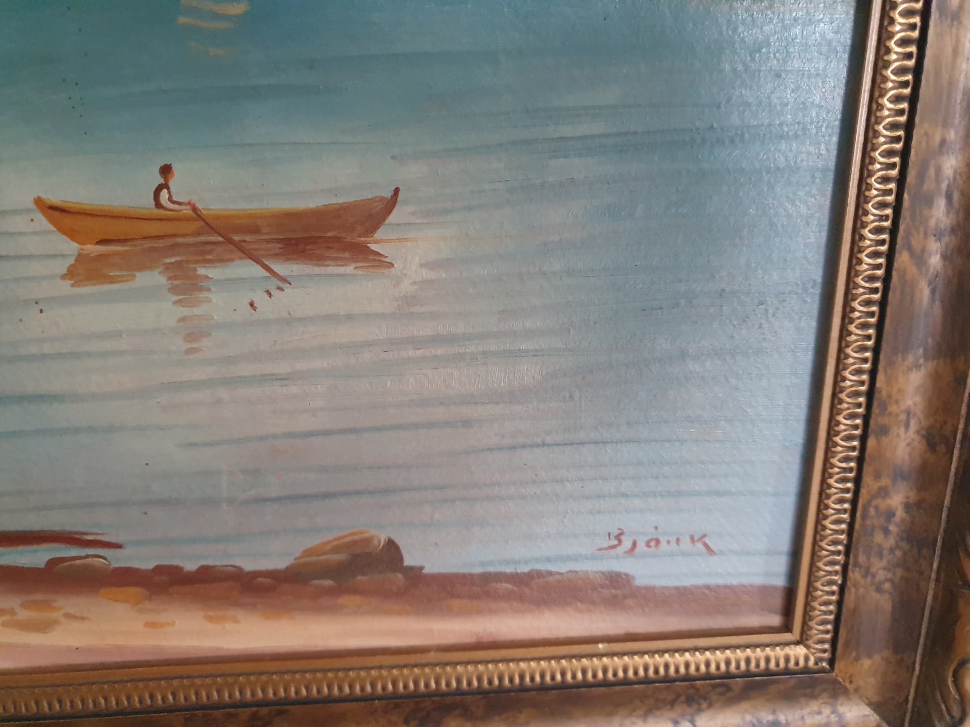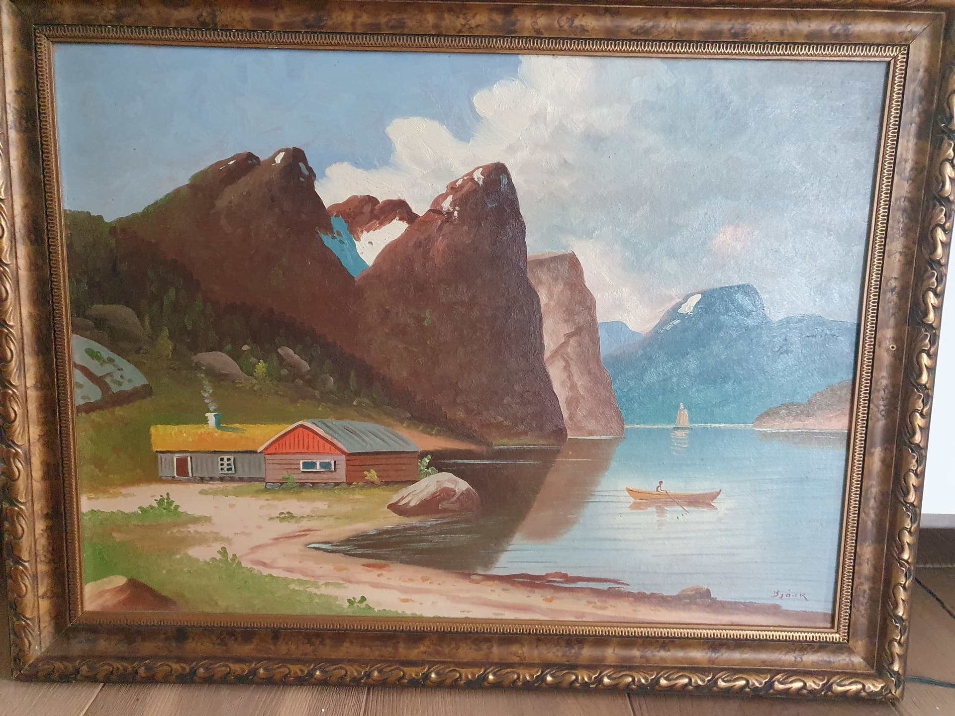 Dette maleriet har vÊrt i min families eie siden 50-tallet. Er det noen her som klarer Ä tyde signaturen. Lurer ogsÄ pÄ mulig sted. Har funnet maleri av Reidar Steinnes med motiv fra samme sted (Fjordlandskap m/fiskebÄter)