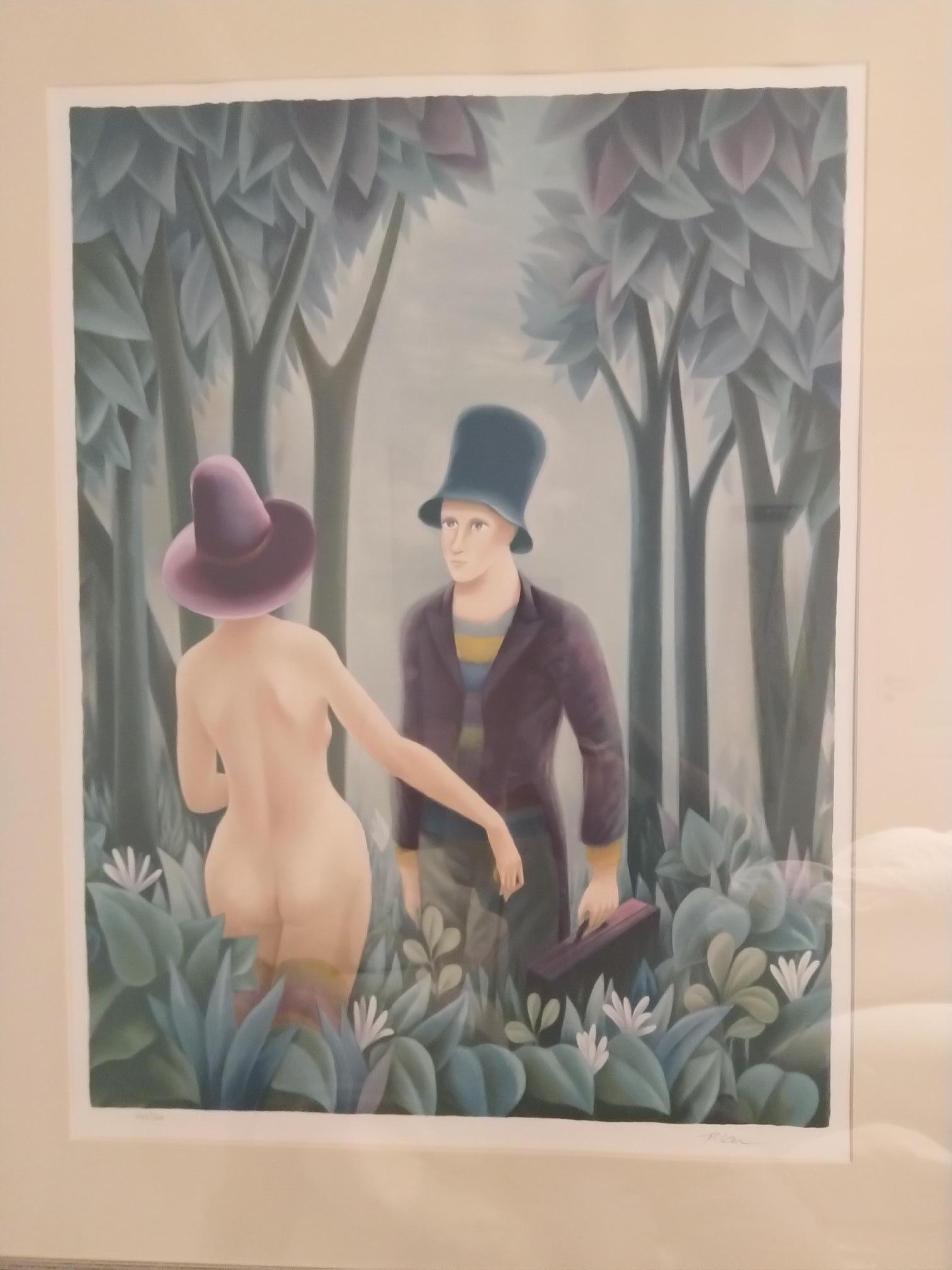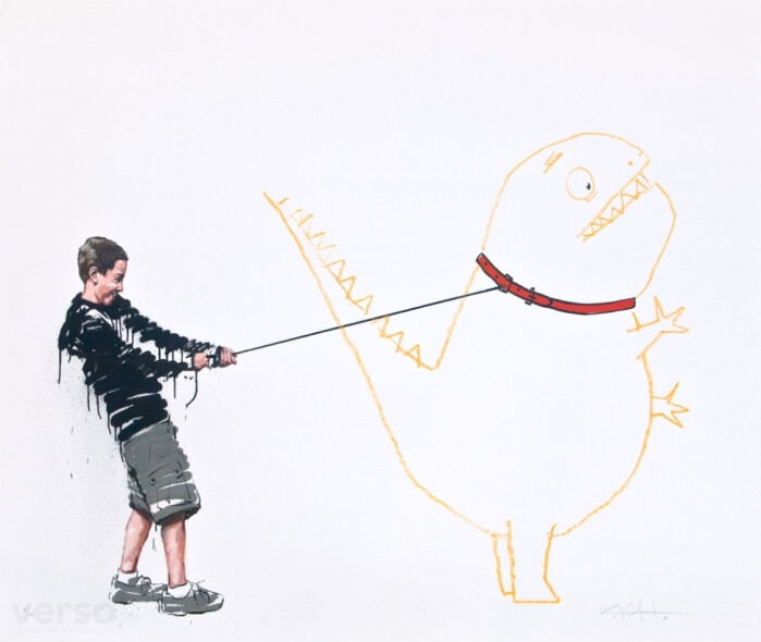 Sliter med Ä huske kunstner og tittel pÄ et print. Det er en unge som gÄr med et monster i bÄnd, som om det var bikkja pÄ luftetur. Noen som forstÄr hvilket jeg mener?