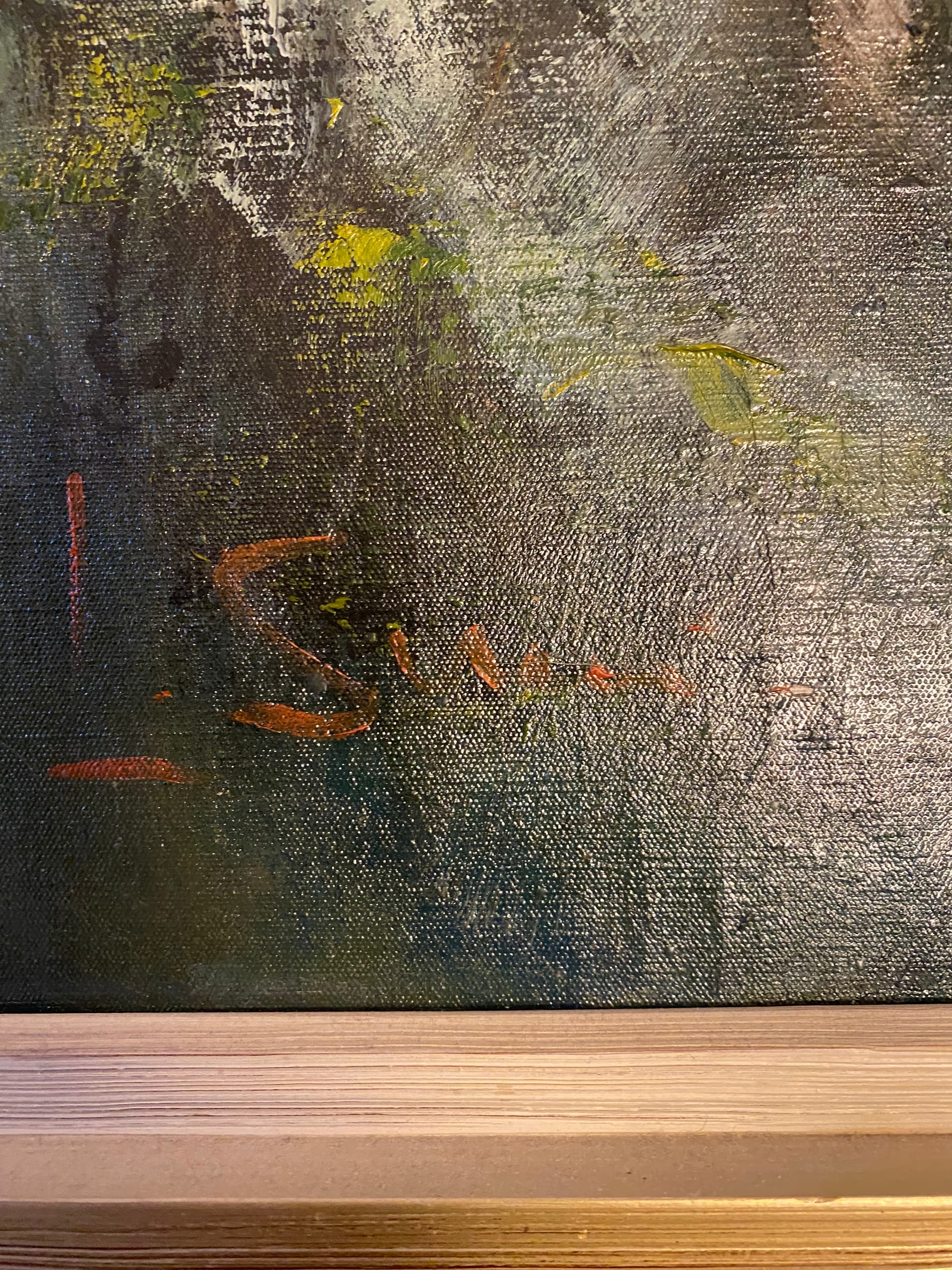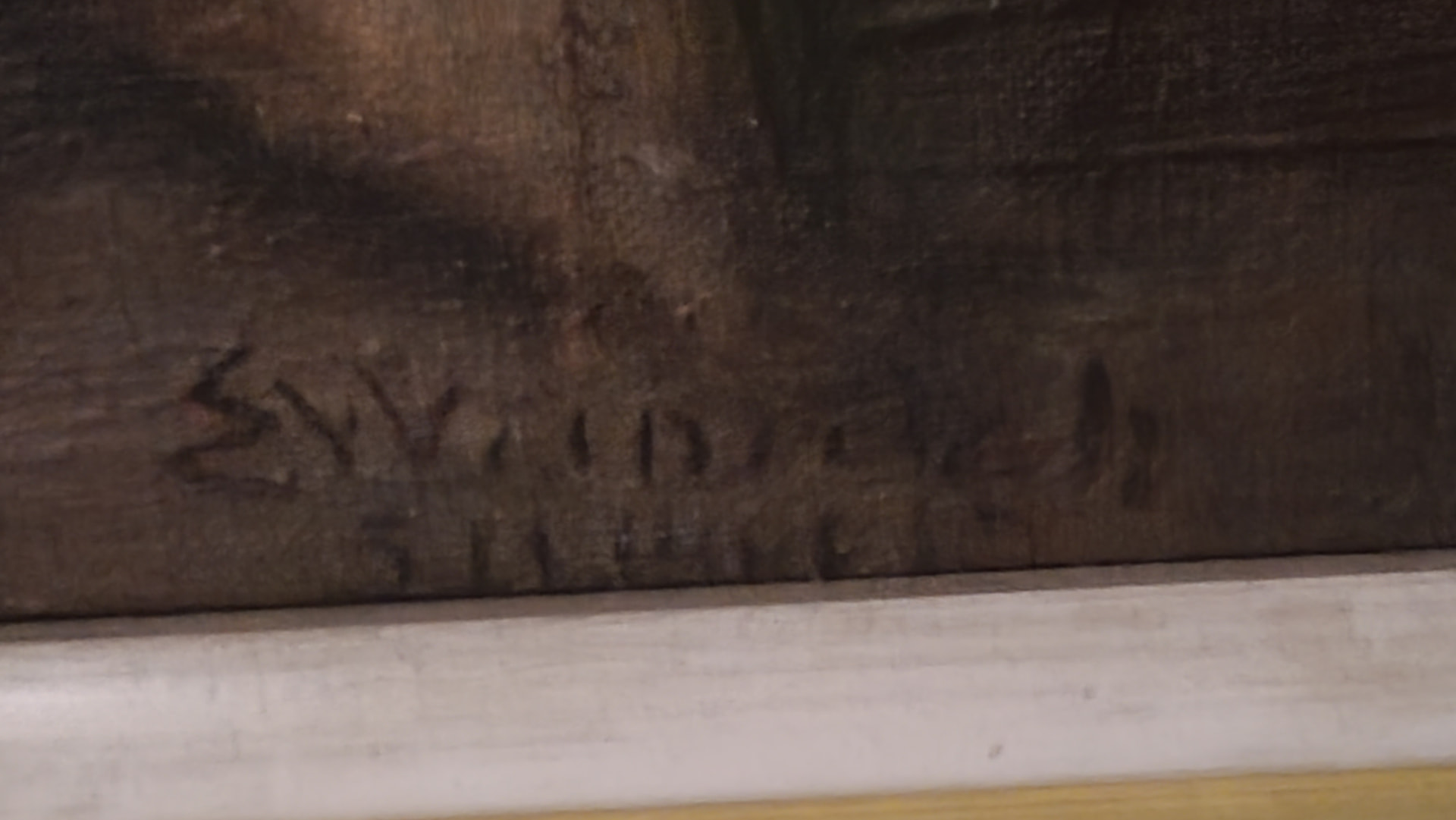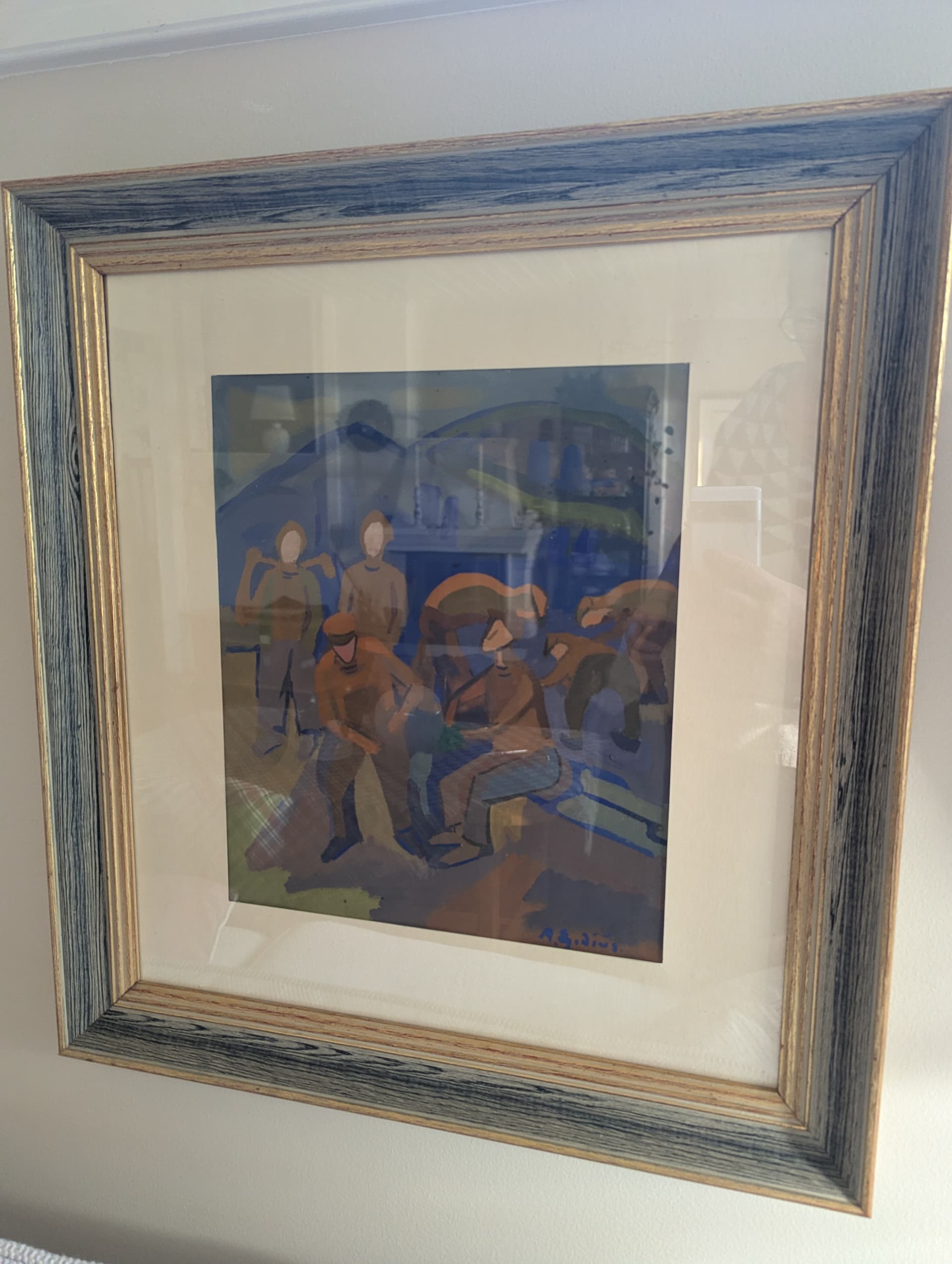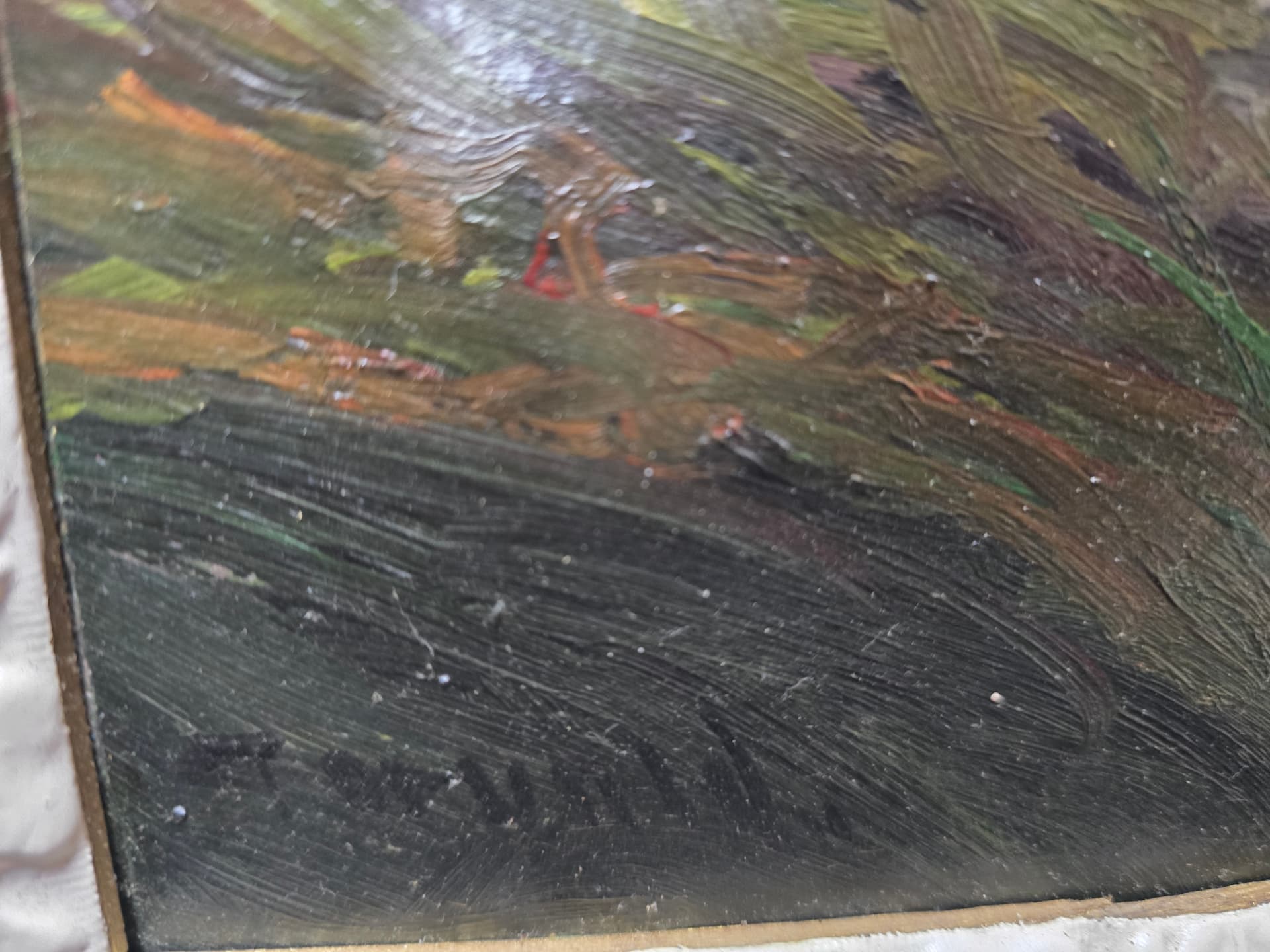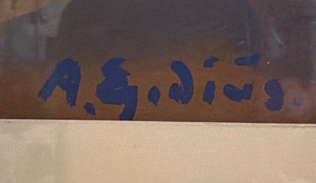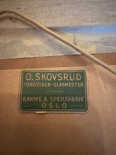 Hei! Er det noen her som drar kjensel pÄ dette bildet og eller signaturen? Legger ogsÄ ved bilde av innrammingsetiketten. Hang i et etterkrigshjem i Oslo, som hadde bilder fra flere andre norske, mannlige kunstnere som var aktive pÄ 30- 40- og 50-tallet. Jeg beklager at det ble sÄpass mye refleksjoner i bildene.