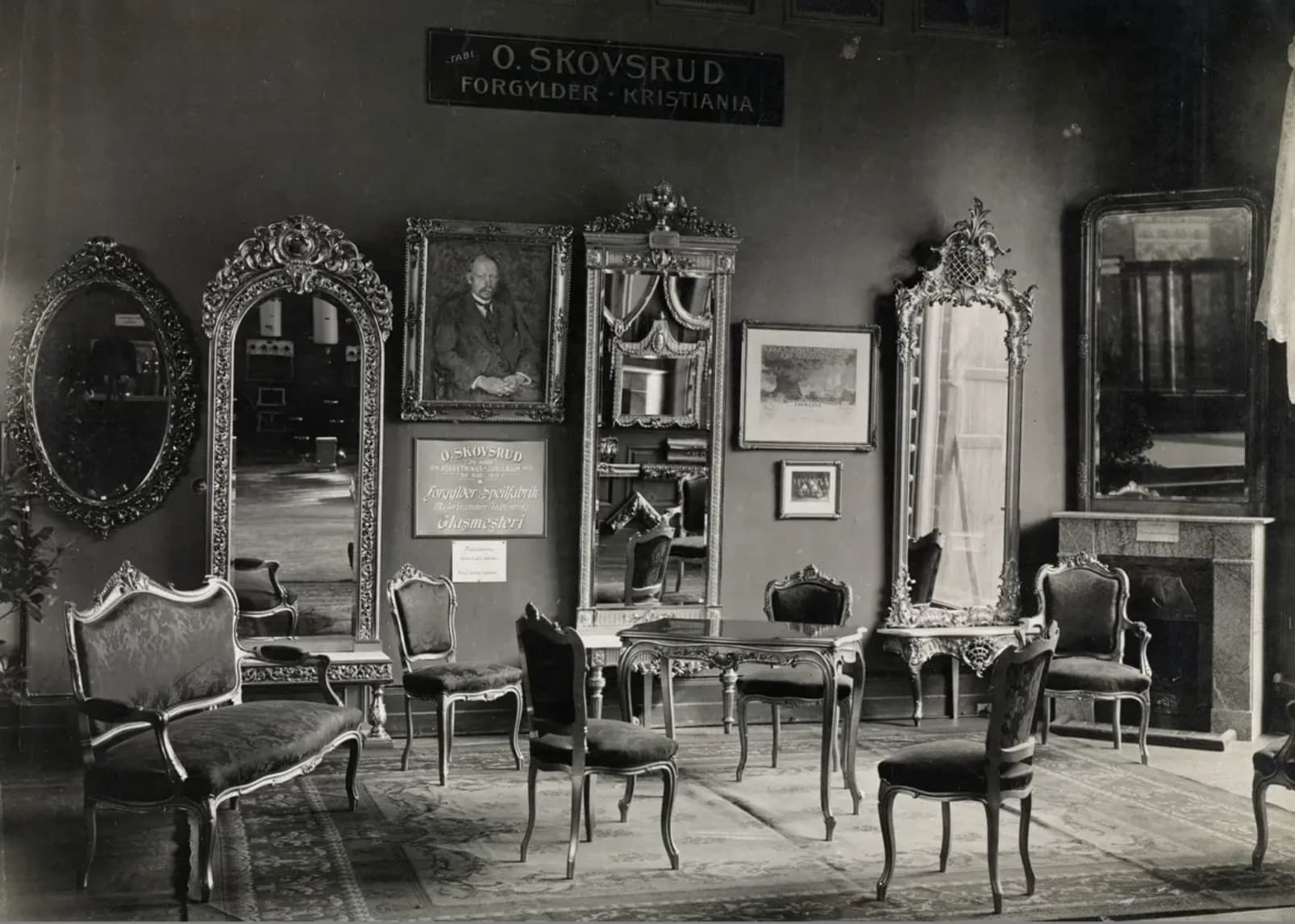 O.Skovsrud Ramme & Speilfabrikk var en av de store rammemakerne i Christiania/Oslo pÄ slutten av 1800-tallet og ett godt stykke ut pÄ 1900-tallet. Her et foto fra 25 Ärs jubileumet i 1919.
