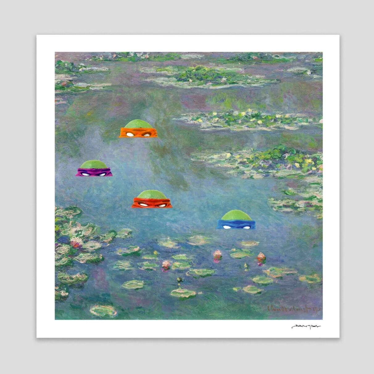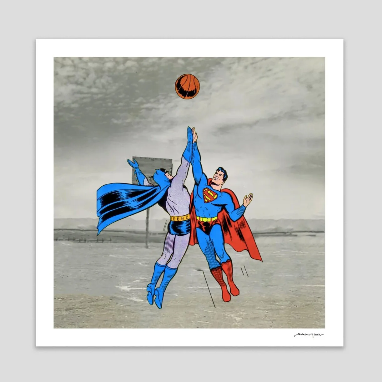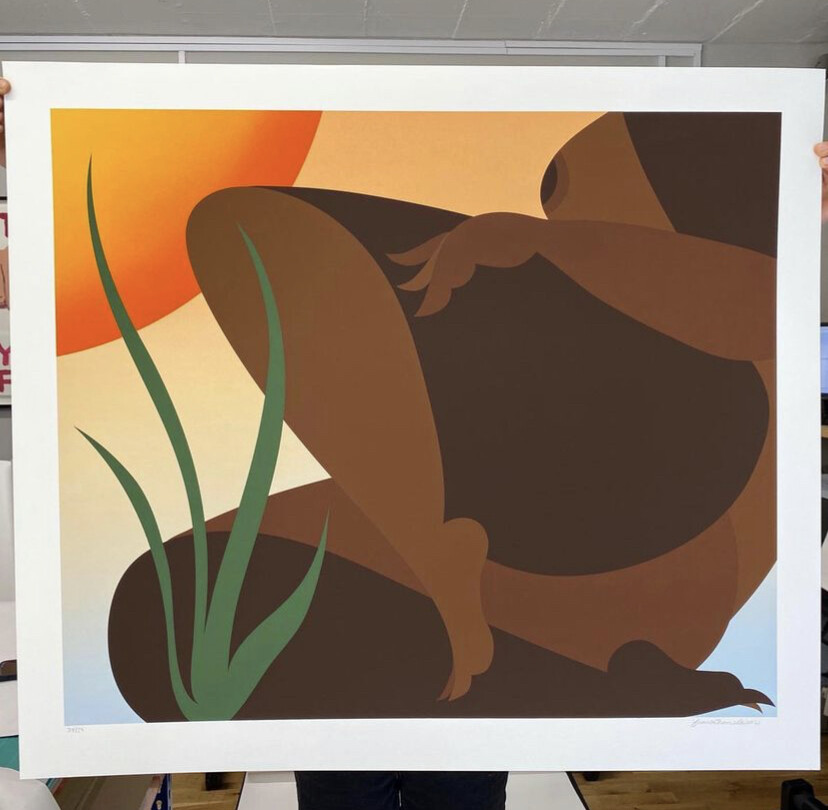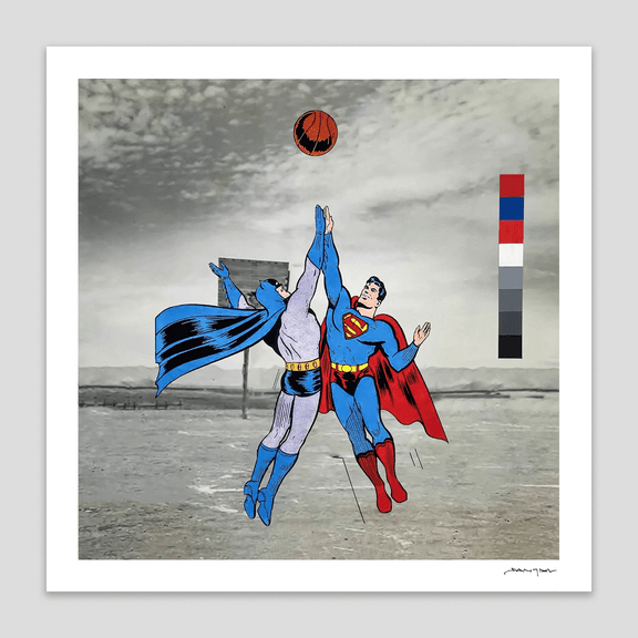 Each edition features unique color block embellishments on the right hand side of the edition. Inspired by the comic books Santlov grew up with, the artist reduces the works to its most essential forms.