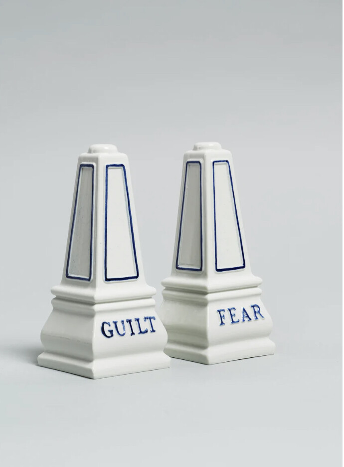 Ragnar Kjartanssonâs Guilt and Fear is a limited edition set of porcelain salt and pepper shakers, labeled âGuiltâ and âFearâ respectively. All 500 sets of shakers are currently installed in There is a song in my heart and a hammer in my brain, Ragnar Kjartanssonâs sixth solo exhibition at Luhring Augustine Chelsea.