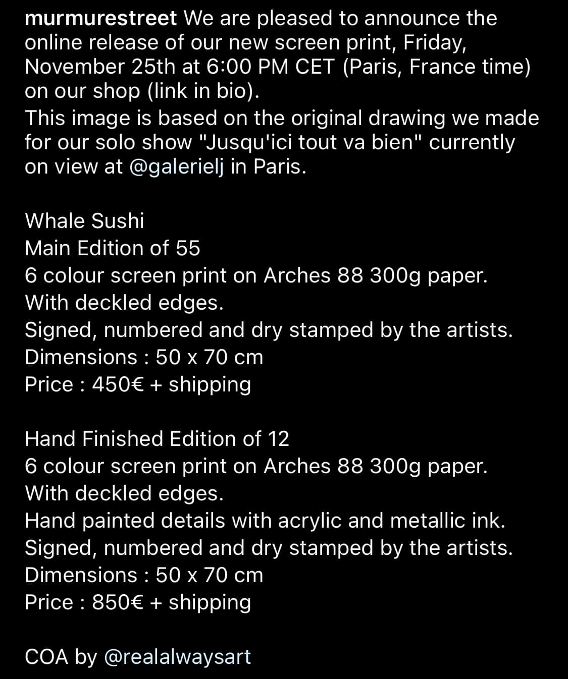 Hi there! So how it works is that you will have 24 hours to buy the timed print edition from the moment Ayako starts painting. She should be finished with painting after 8 hours. As soon as she’s done we’ll start working on making a print based on the painting. The print will be a full bleed UV-cured pigment print with a silkscreen varnish layer.
