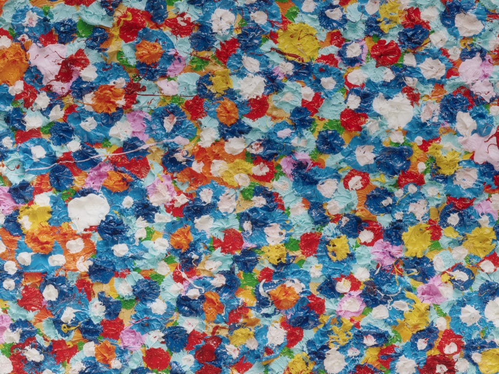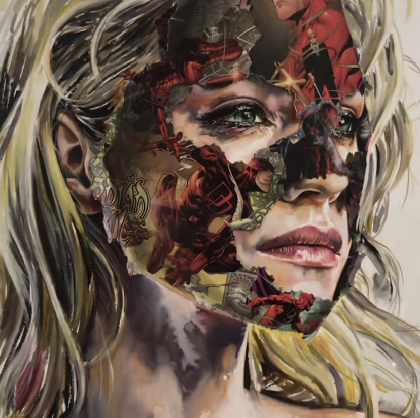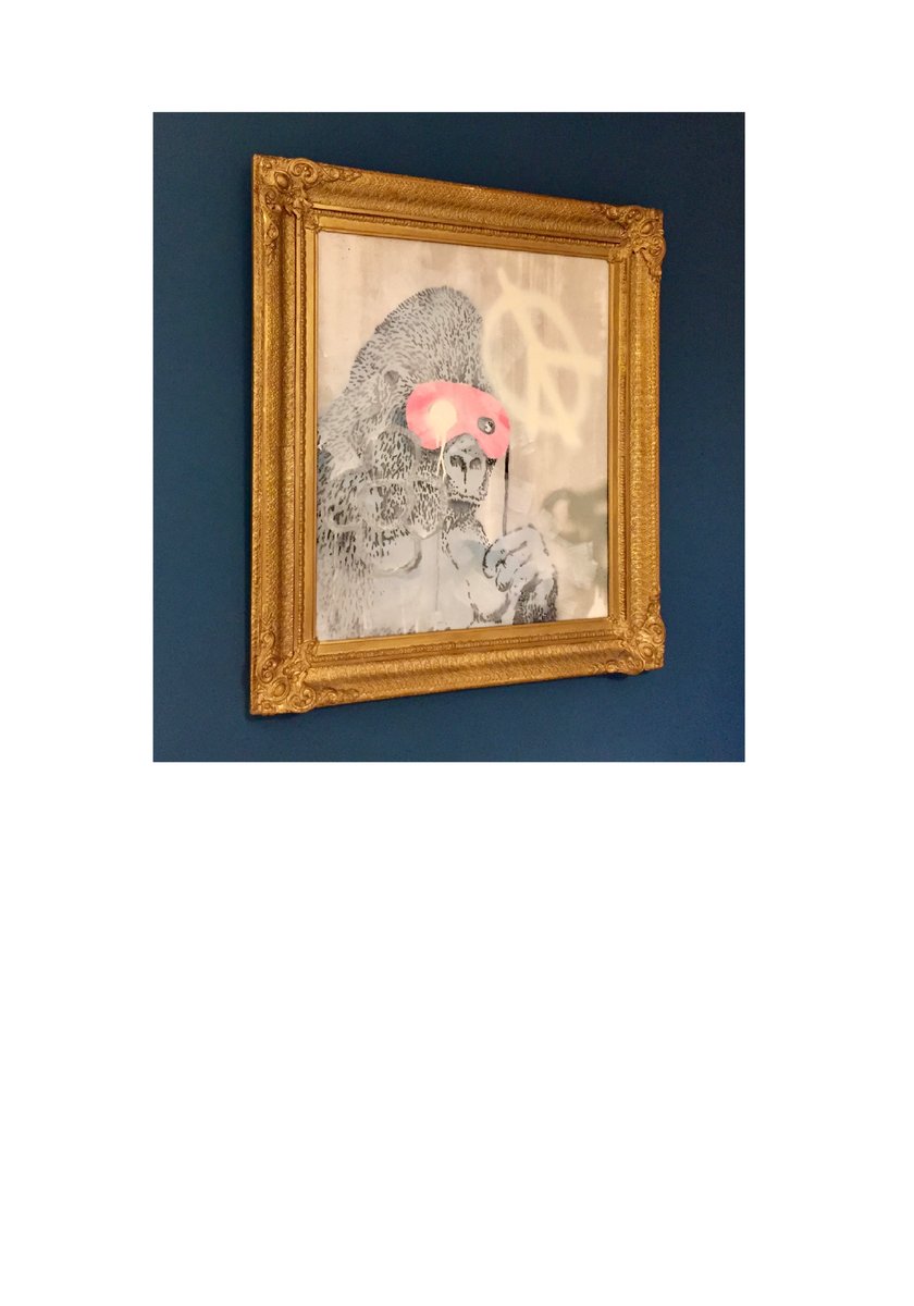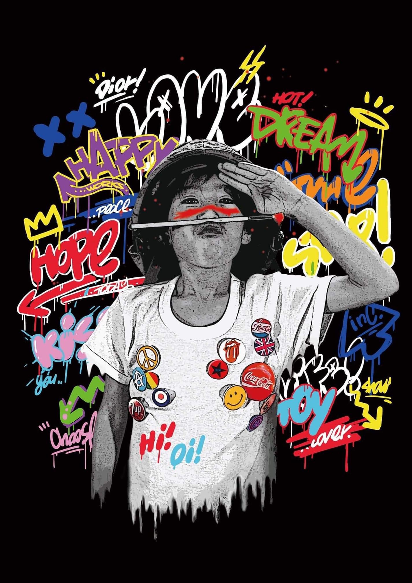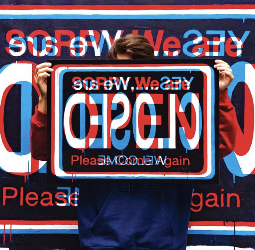 Medium: Spray paint, screen print, acrylic and whitewash on wood board