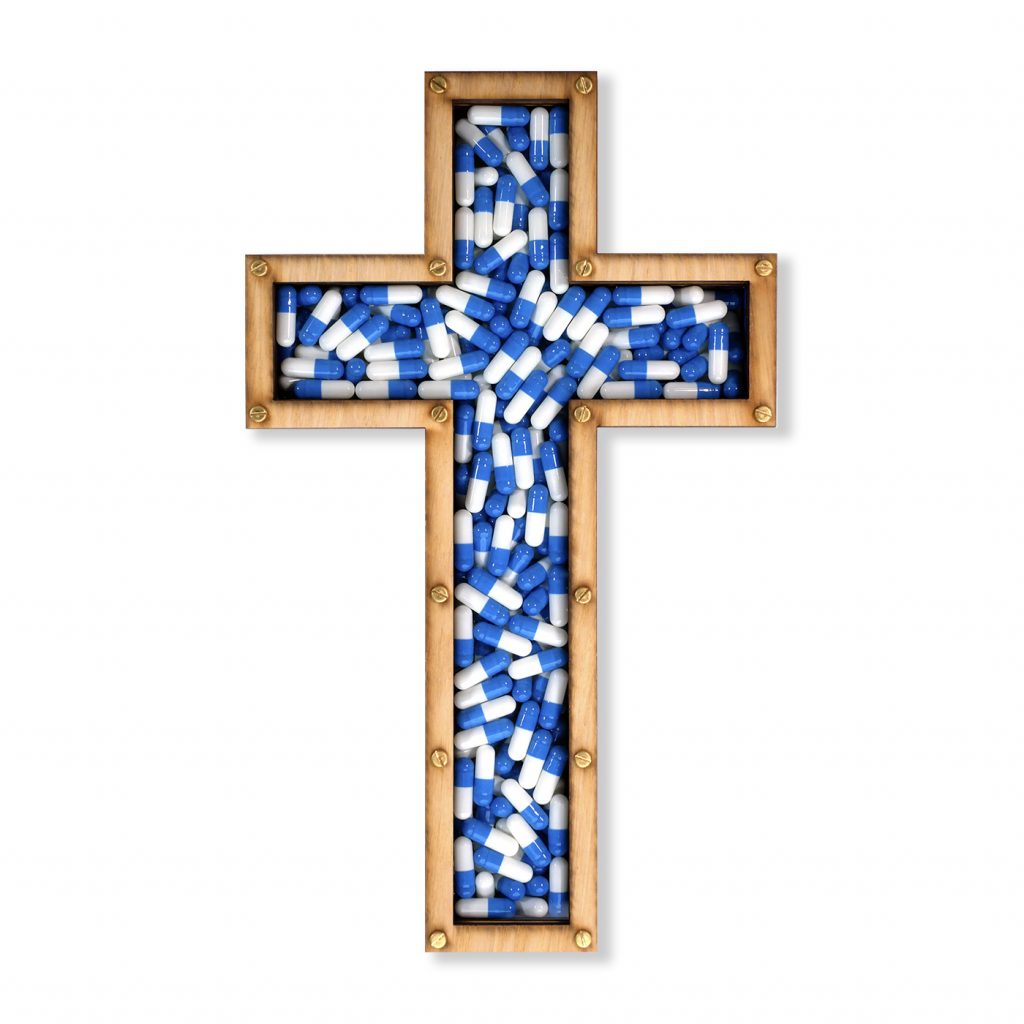 An edition of 50, signed with edition number laser etched on the reverse. Oak front with blue & white pills behind clear perspex fixed with brass nuts & bolts. Comes in a dust bag along with a certificate of authenticity.