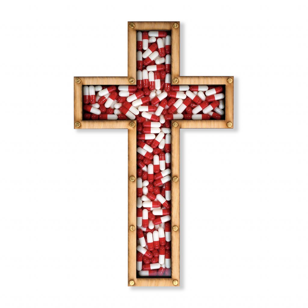 An edition of 50, signed with edition number laser etched on the reverse. Oak front with red & white pills behind clear perspex fixed with brass nuts & bolts. Comes in a dust bag along with a certificate of authenticity.