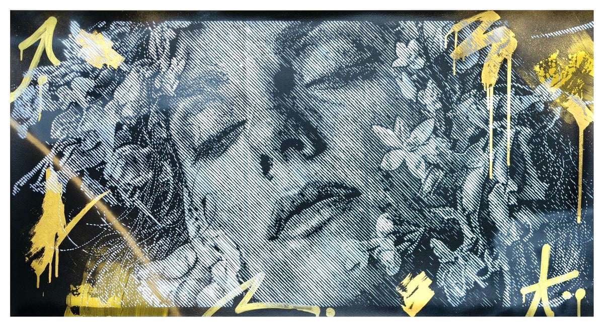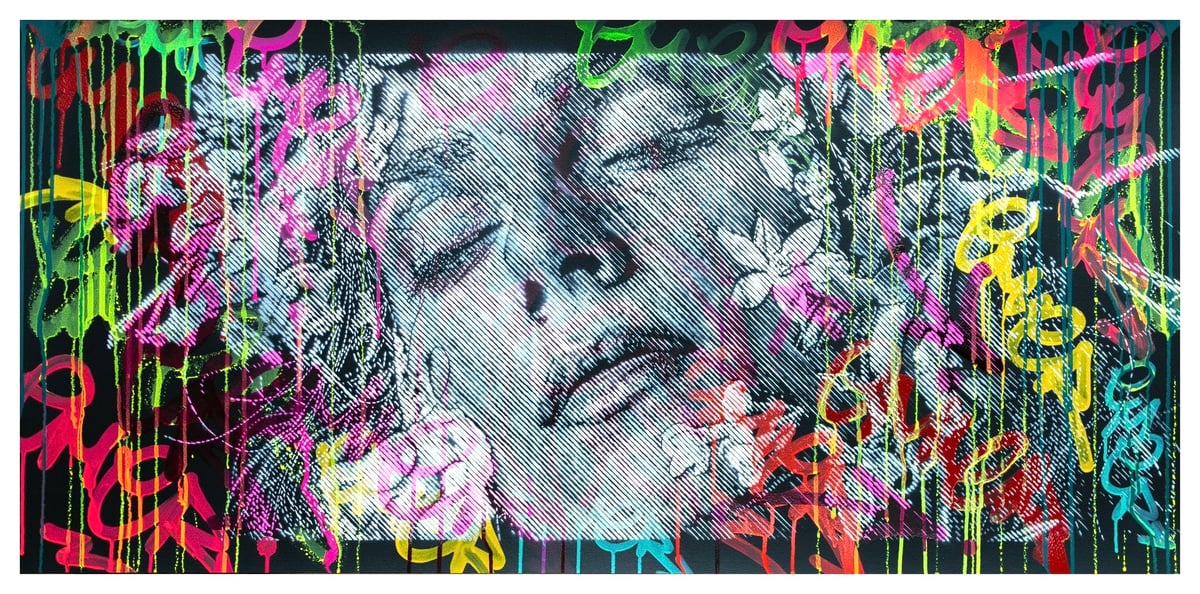 Original hand-cut stencil, acrylic, ink and spray paint on paper.