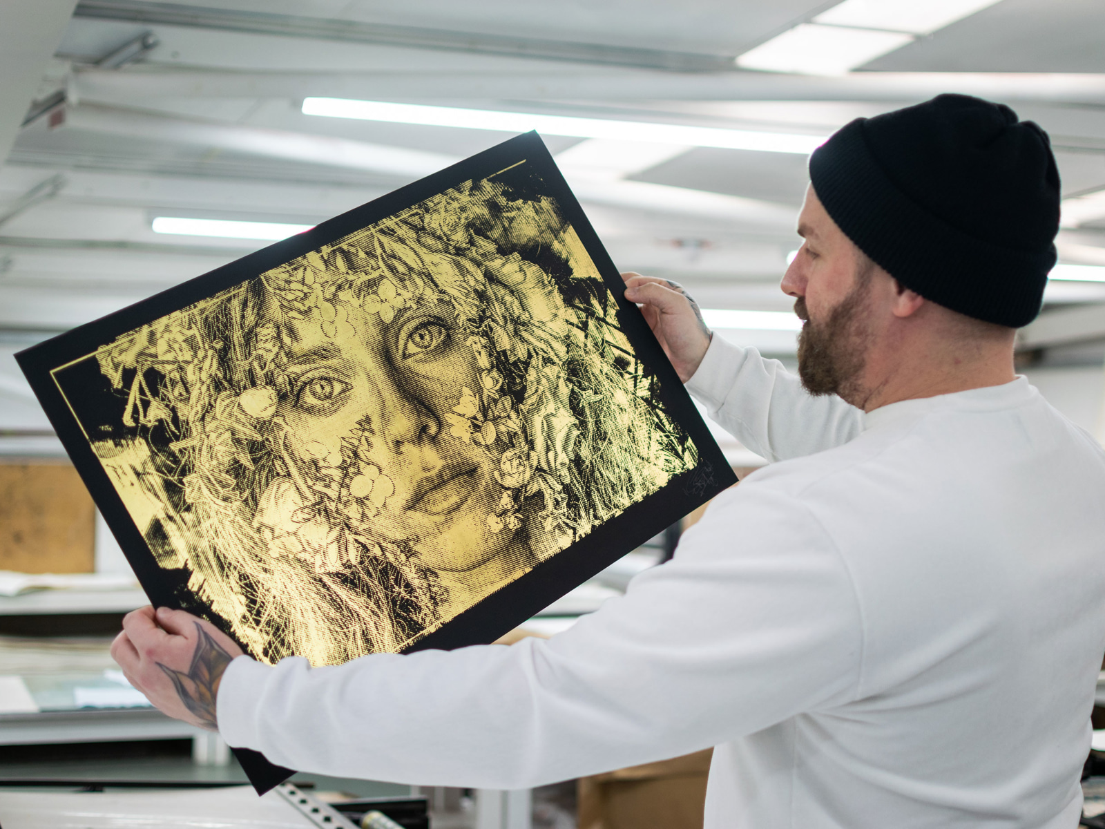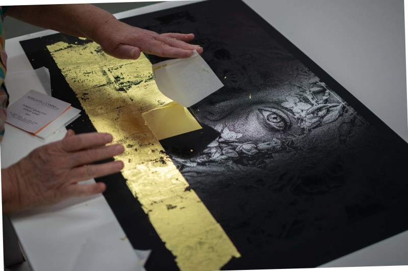 The print will be available in variants of Gold, Silver and Copper, each an edition of 25. Also accompanied by a special 24ct Gold Leaf edition, of which there are 8 prints. With this edition, Gold Leaf is hand-applied in replacement of screen print ink, leaving the same impression from leaf. Each print is 70.3 x 47 cm and produced by Goldmark Atelier.