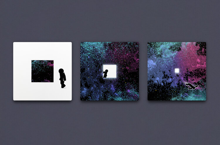 TITLE: And I’m Floating In A Most Peculiar Way DIMENSIONS: Each square is 28 x 28 x 1.8cm, sold as a triptych set MEDIUM: Spray paint MATERIAL: MDF EDITION SIZE: 5 MISCELLANEOUS: Signed, numbered and iron branded on reverse, keyhole slot for wall hanging