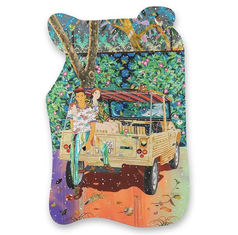 Medium: Screenprint hybrid on 410gsm Somerset Enhanced Satin paper, finished with damask-patterned silver leaf details and a high gloss varnish coating. Comes in a bespoke white frame contoured to perfectly match the shape of the print