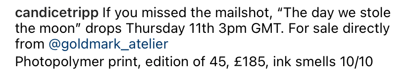 Medium: 26 colour screen print with unique hand finished elements in acrylic paint, charcoal and 24k gold on Coventry Rag Vellum 320gsm.