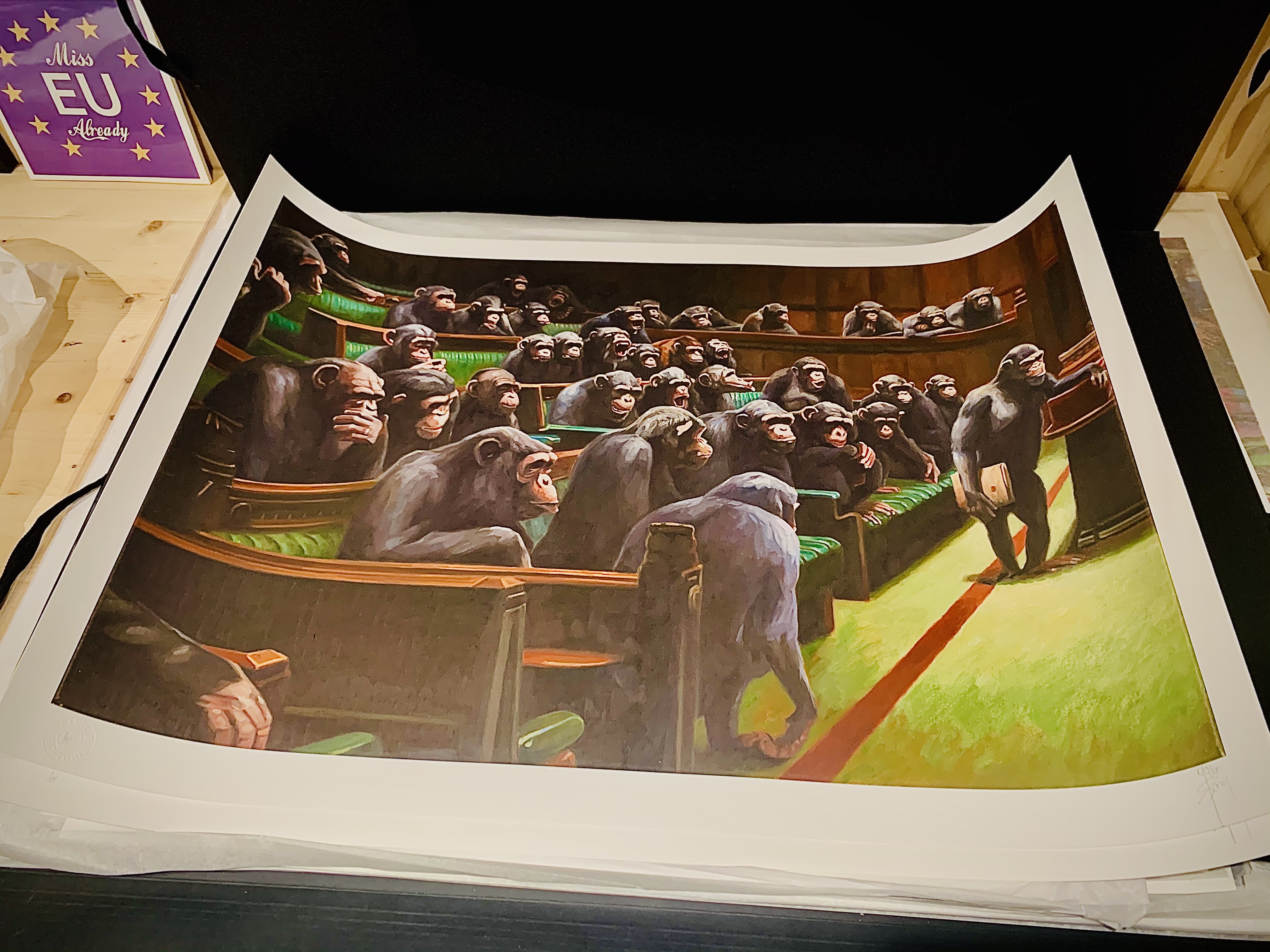 Altså, akkurat det tror jeg det er enighet om. Storm har ikke noe med Banksy eller teamet å gjøre, og Banksy sitt Monkey Parliament er ikke laget av Storm. Men han sier selv han har laget sketsjen til trykket han nå har gitt ut, og det lenge før Banksy sin versjon kom ut (ref instagram). Hvis han bare ville tjene på Banksy, så burde han jo ha gitt ut hele bildet - noe han ville tjent langt mer penger på. Så jeg er tilbøyelig til å tro på det han sier, men mulig jeg er naiv. Ingen vet vel sannheten her, og at Banksy er et slags fyrtårn for etterettelighet og sannhet er nok like naivt, sånn sett.
