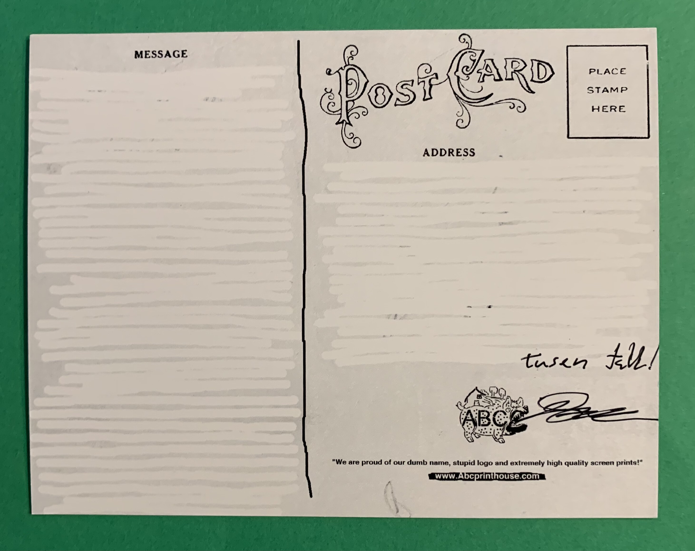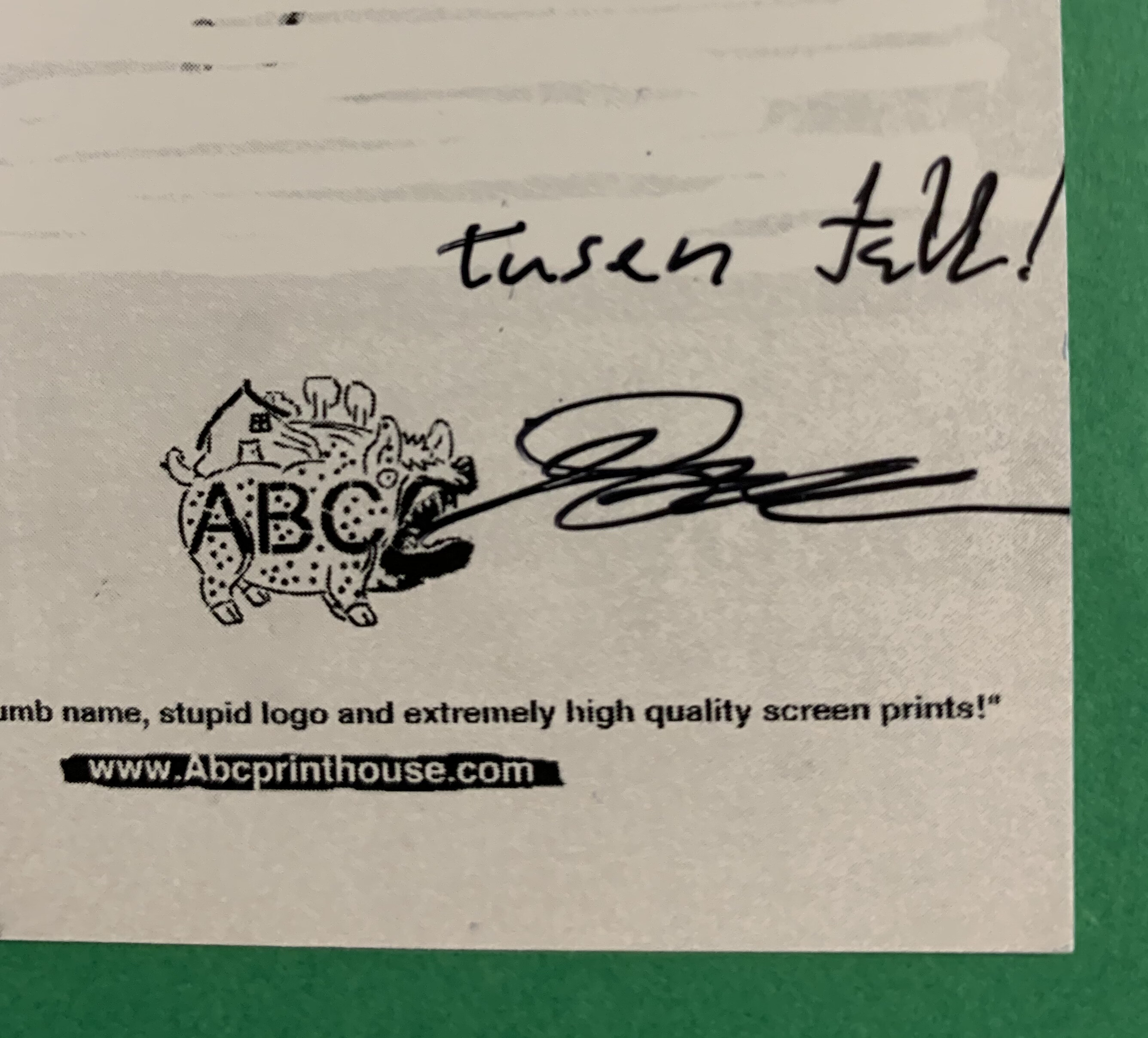 Bare en kuriositet, men kjøpte en Pøbel (fra ABC) tidligere i år, og da lå dette kortet med. Har ikke kikket nærmere på det før nå, og jammen var det ikke en liten hilsen der. Dette må da være en uhyre verdifull skjeldenhet