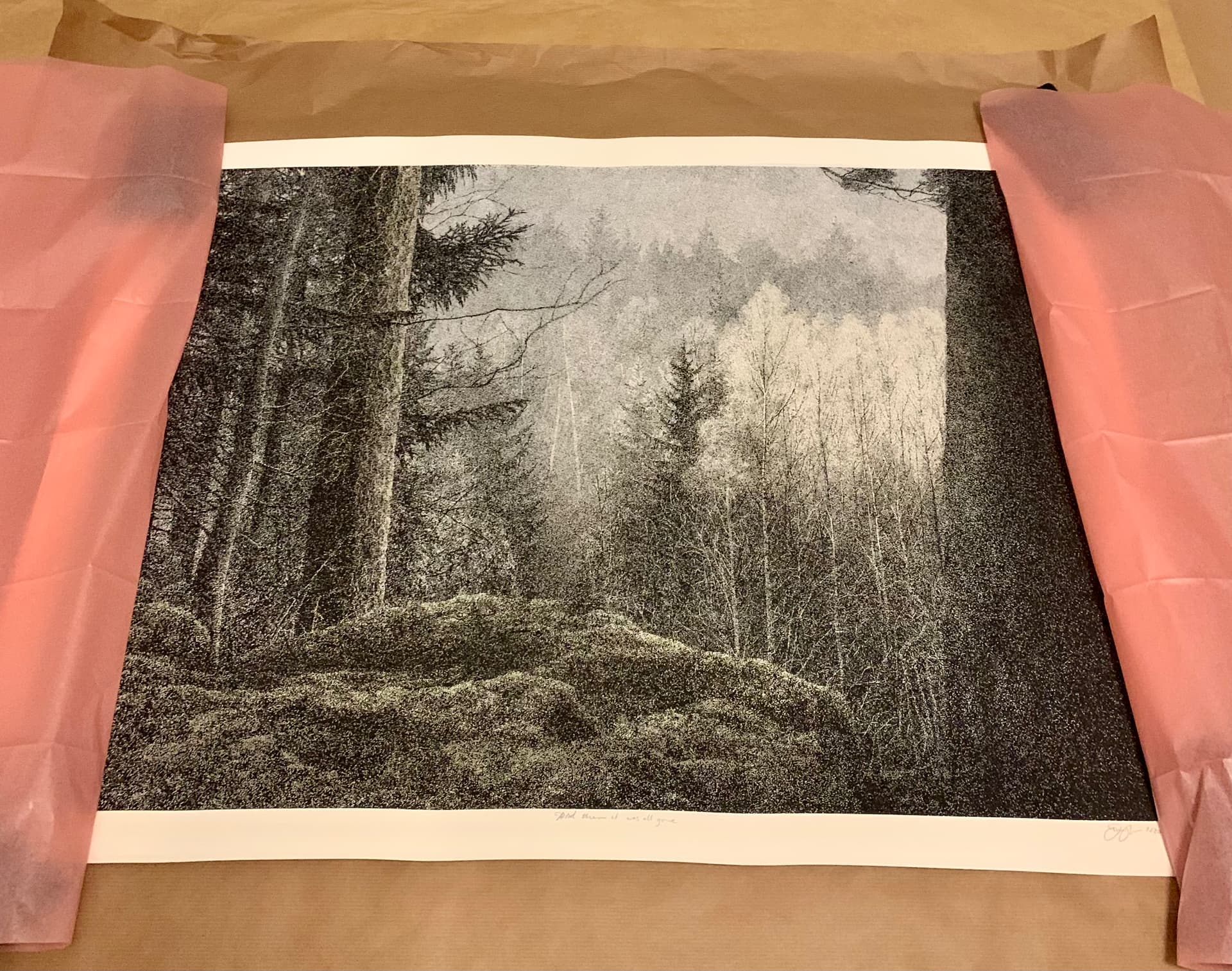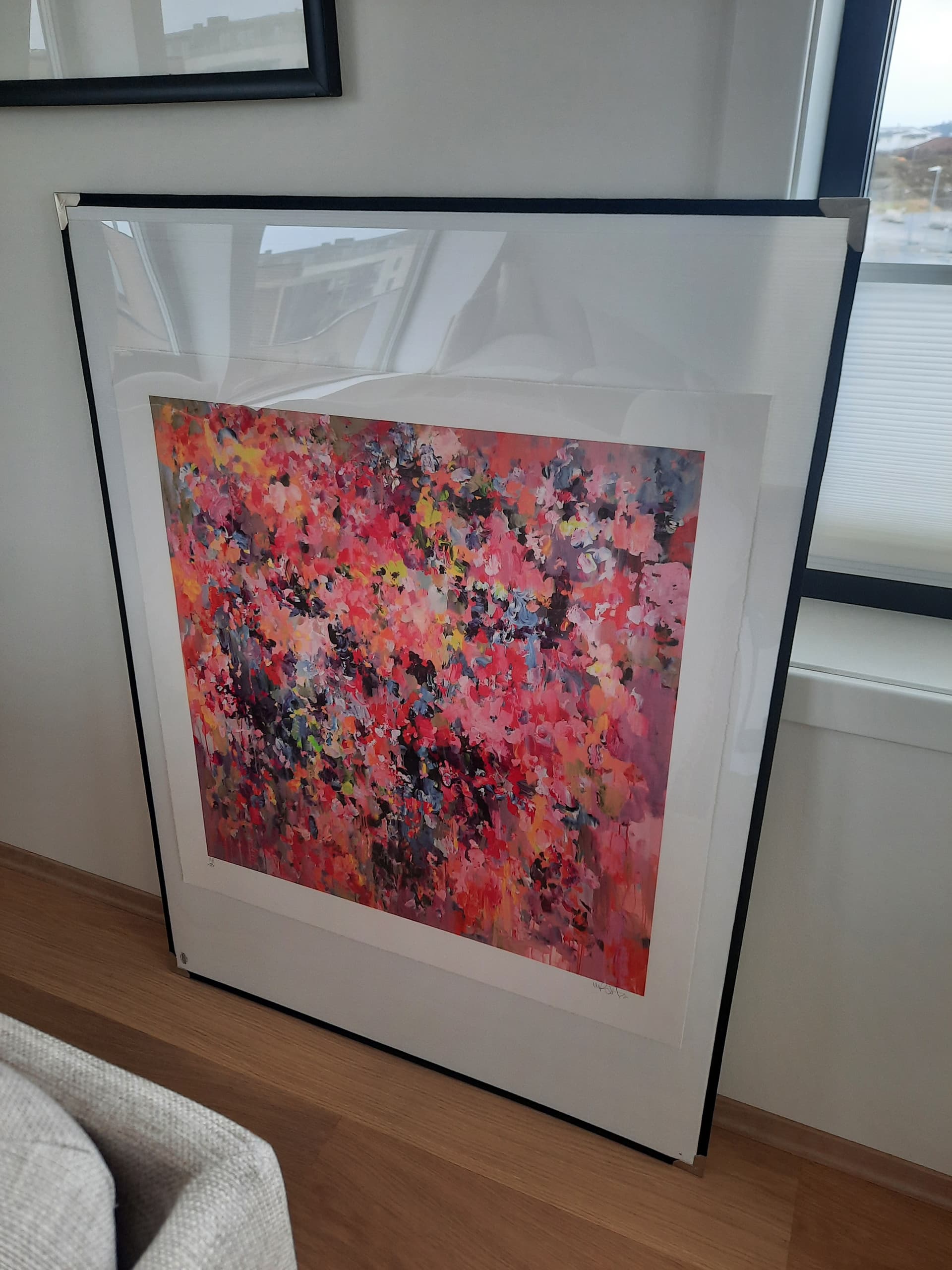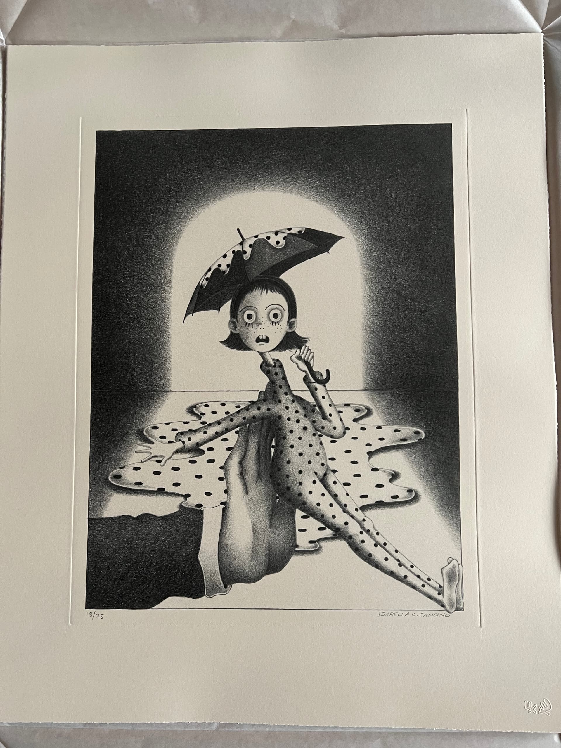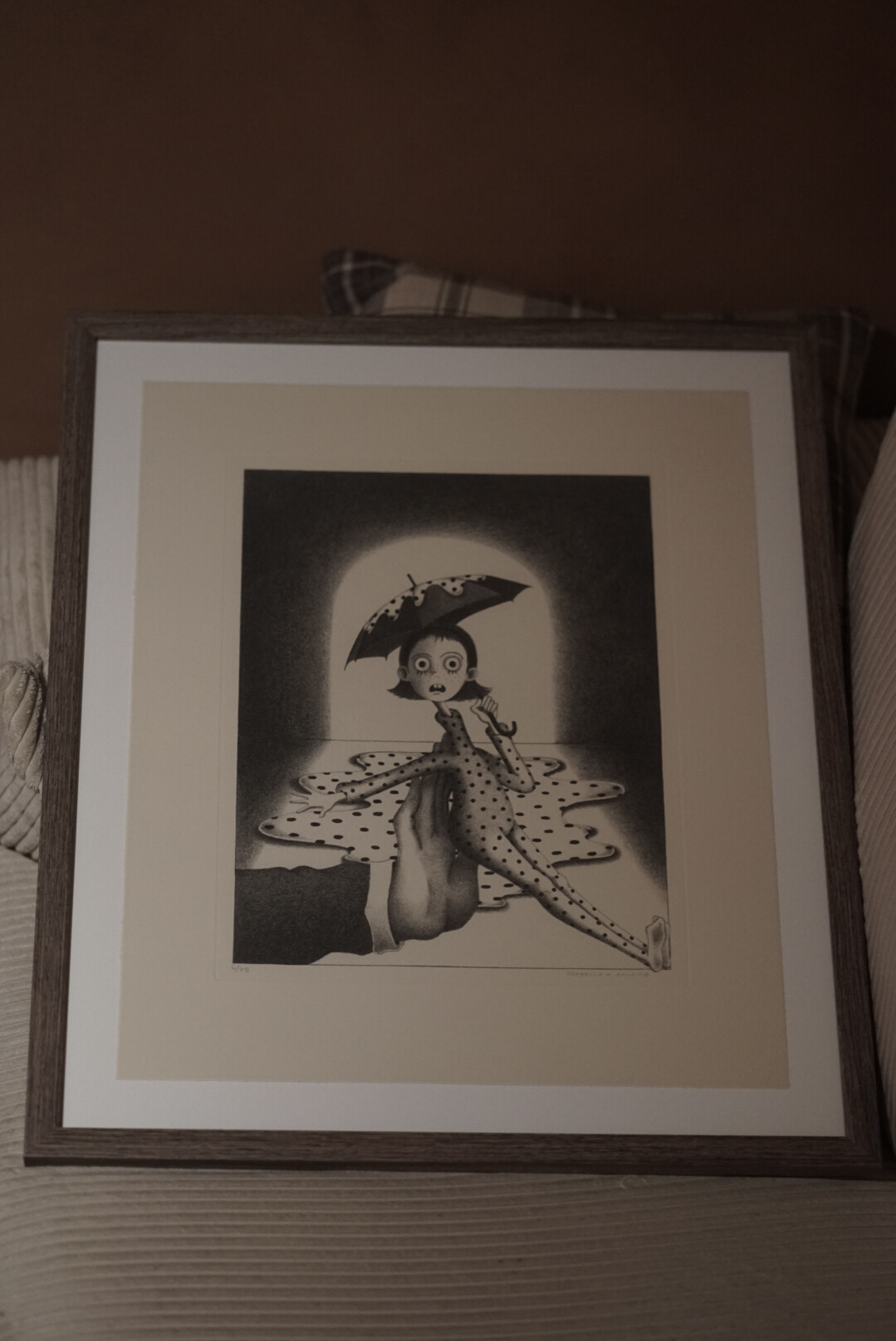 Den kjempefete etsinga til Isabella Cancino. Mulig denne reinnrammes på sikt da bakplata i offwhite ble fortsatt veldig hvit i forhold til papiret. Sort bakplate evt pp kanskje. Vi får se. Del gjerne ferdig innrammede dere andre som kjøpte denne også. Ett kjempeverk av en kommende stjerne på kunsthimmelen.