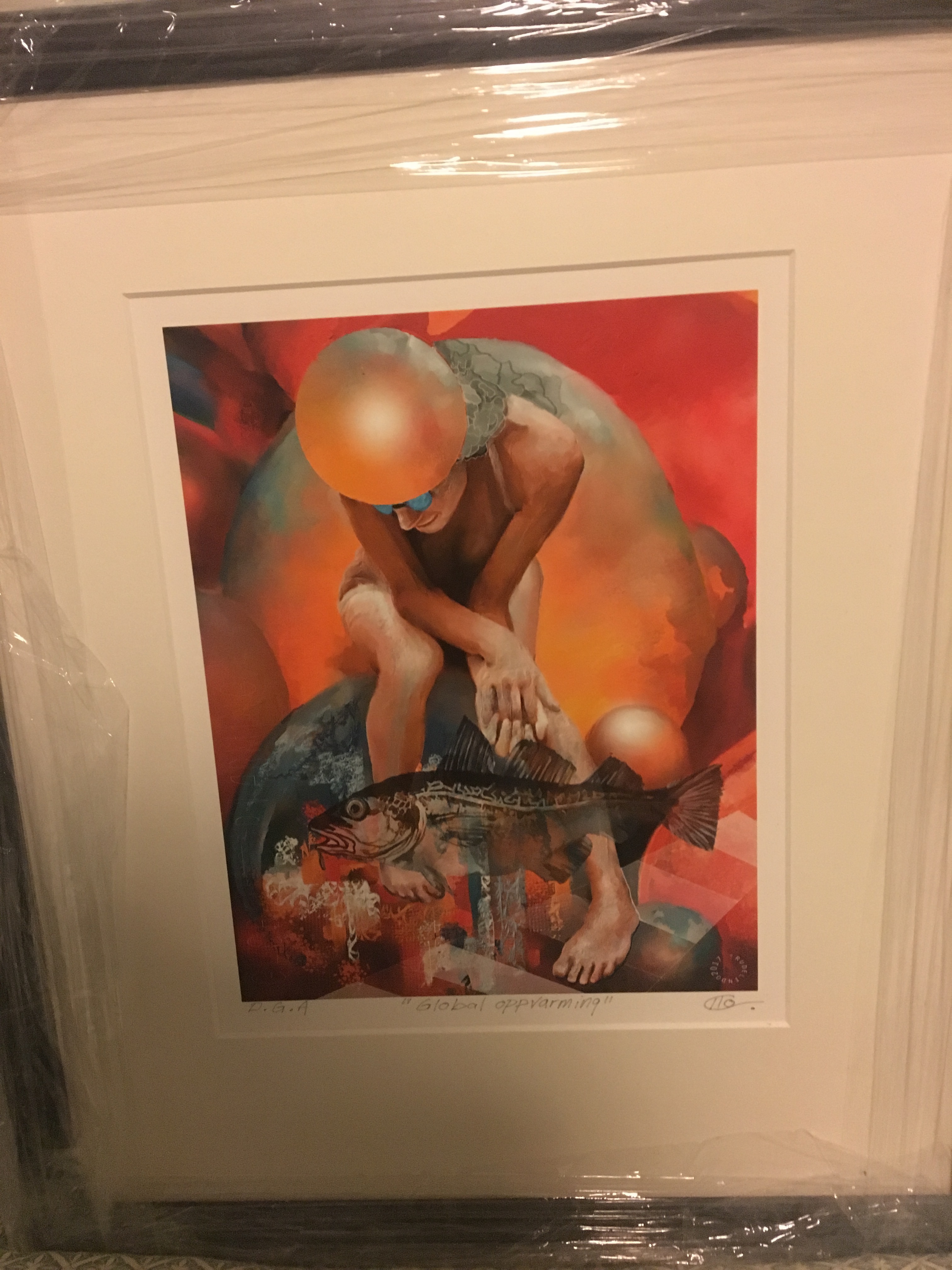 Fisker´n flyter på sort plate, og har fått off-white passepartout for “innramming”.