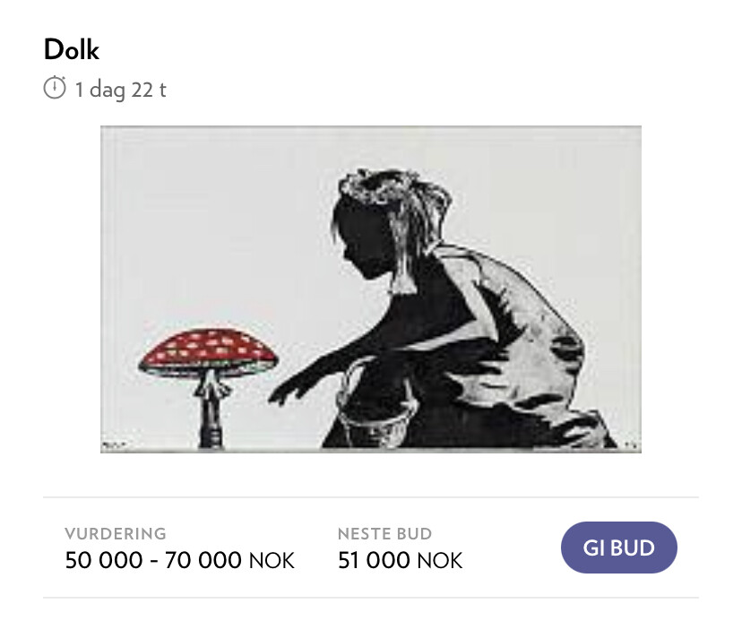 Det blir spennende å se i morgen. Jeg registrerer at mange originaler og dyre verk er uten bud. Det har vel alltid vært en utfordring med prising og annenhåndsomsetning av disse, sammenlignet med trykk. Kanskje fordi det blir for dyrt for vanlige folk. Om noen profesjonelle aktører ønsker å bygge opp en gatekunstsamling i Norge, så kan det være gunstig å støvsuge denne auksjonen og sikre seg mange verk til minstepris i morgen. Tviler på at det blir mange budkamper på verk over 50k. Om f. eks. Ako Foundation er på her, så kan de fylle opp kunstsiloen i Kristiansand, tilnærmet uten konkurranse.
