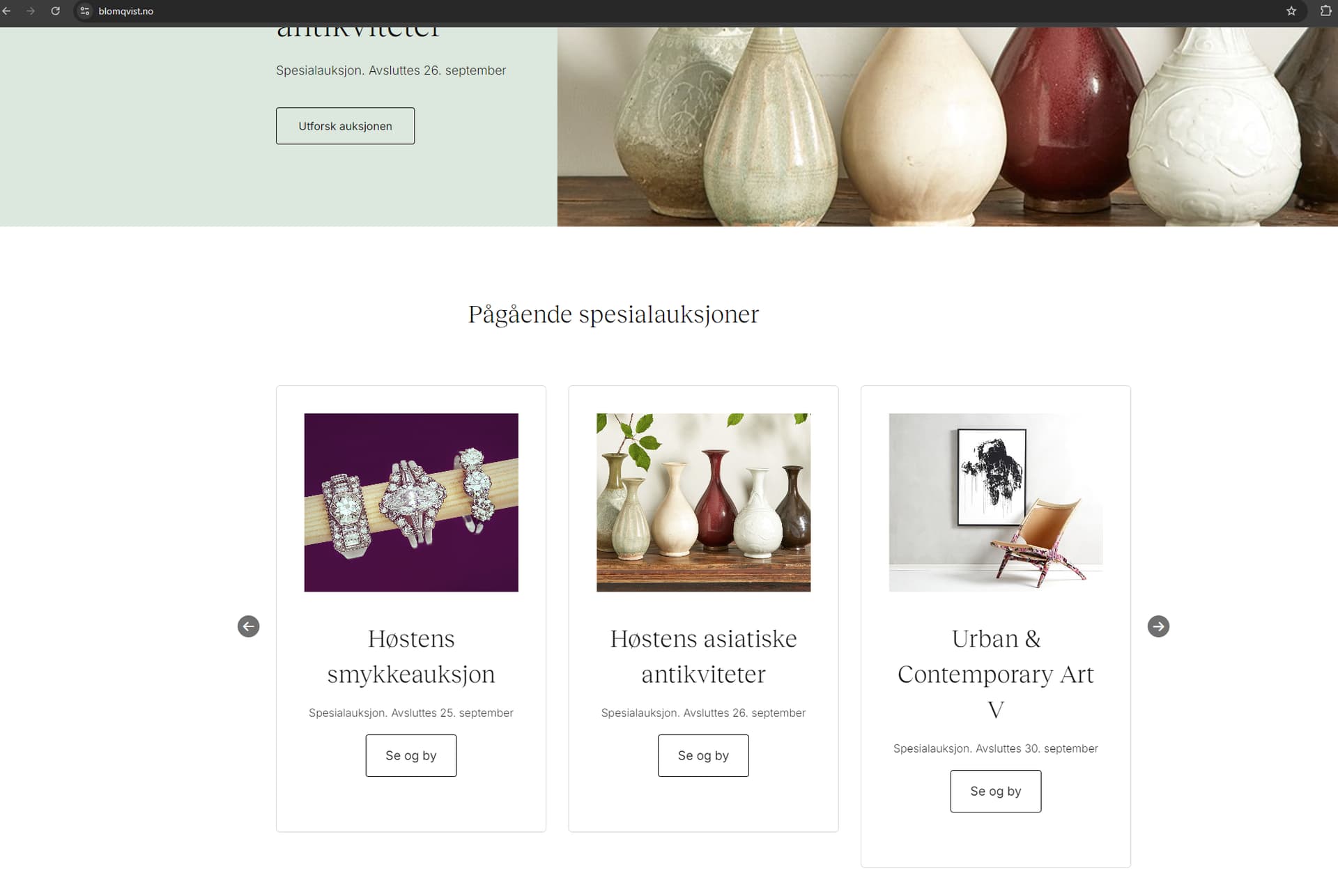 Har kjøpt to fantastiske objekter via Blomqvist i år og blir bra å teste å selge via de også. Som Julia sier, så betaler man «premium» for håndtering, oppbevaring, synlighet, kundekontakt, betaling, frakt ect for minimal anstrengelse. Objektets etterspørsel og tilgjengelighet vil være en fin indikator om du bør heller selge på Finn enn auksjon. Ellers, så krysser man fingrene for at markedsansvarlig for årets auksjon har fått økt budsjettet noe for omtale og synlighet i sosiale medier.