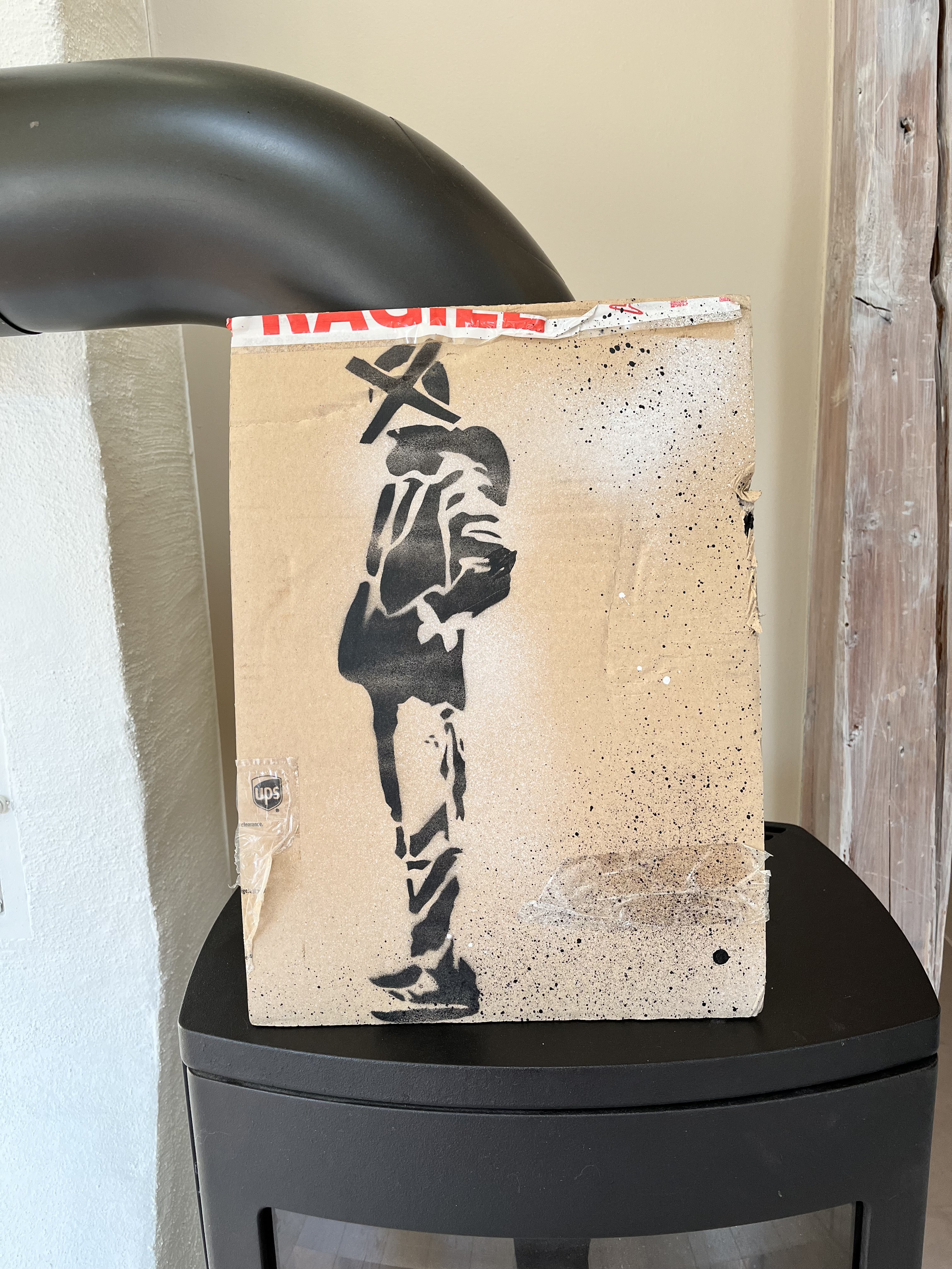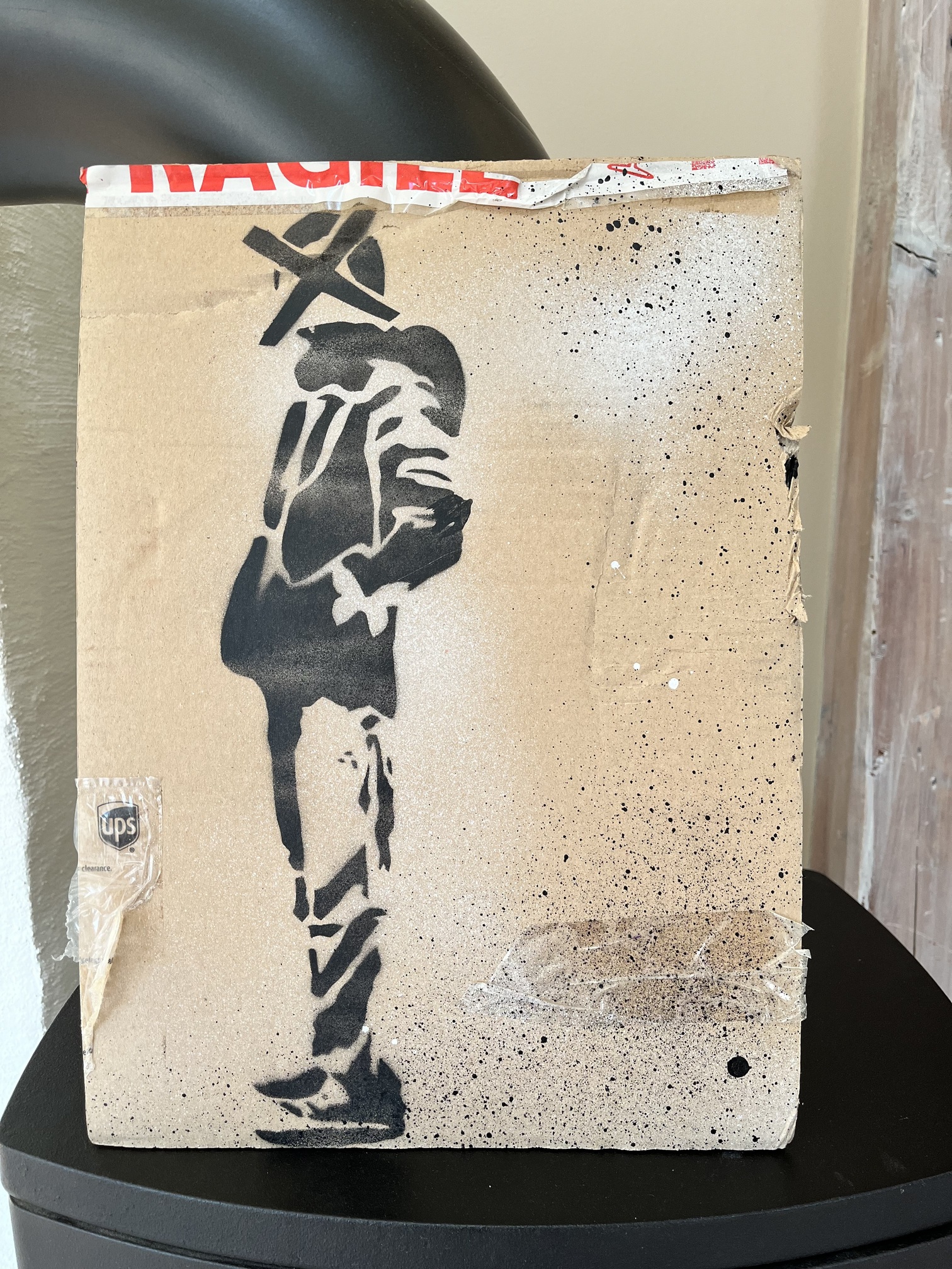 Verket er en original sprayet på papp av Nafir da han var her i forbindelse med en utstilling på Collective 34. Det er ikke signert. Se nøye på bildene før bud. Papp-plata er ikke strøken, og det var den ikke da den ble sprayet heller.
